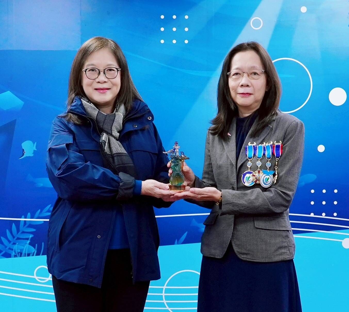 海洋委員會黃向文副主委即將於明日(1/16)卸任,海委會上週五由管碧玲主委親授最高榮譽之「海洋、海巡、海育、海研」共四項一等專業獎章。管碧玲主委祝賀黃向文副主委卸任並感謝她的卓越貢獻,細數黃向文從三人開始草創海保署,推動《海洋保育法》從無到有,深度參與我國海洋保育與治理制度建構,並盛讚黃向文是她最重要的專業夥伴。