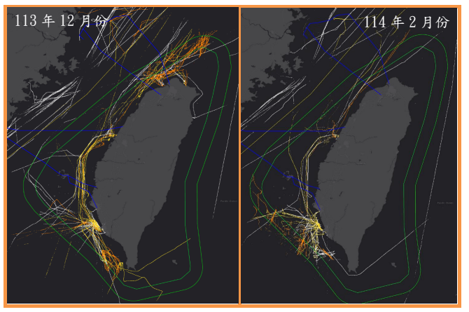 根據國海院分析96艘黑名單權宜輪主要活動海域,係我國西部商港(包括基隆、臺北港、臺中港、高雄港),而高度威脅船舶軌跡則主要集中於基隆港以北海域,去年10月以來活動量分別為10月份39艘、11月份47艘、12月份46艘、1月份45艘、2月份38艘。