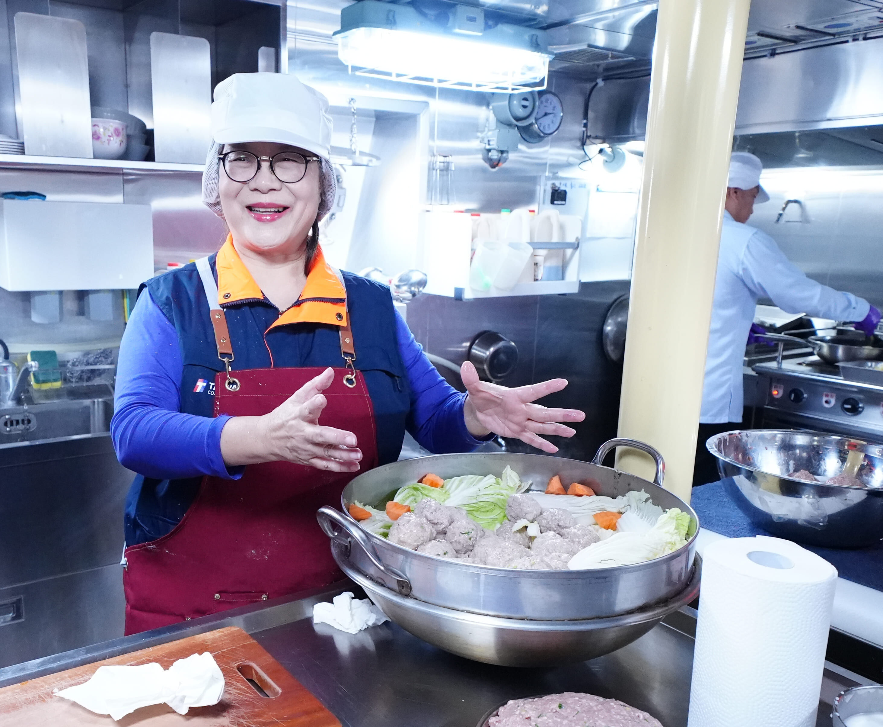 長濱艦梁乃文艦長說,他代表艦隊同仁感謝主委、署長與分署長親自登艦下廚,在海上能吃到主委與長官們的親手料理,感到非常地溫暖,有媽媽、爸爸的味道!艦上大副林政佑也分享,弟兄們光是在滷製的過程就已經食指大動,開蓋後香氣四溢的獅子頭馬上被分食一空,甚至連滷白菜的湯底都沒剩下,管媽招牌拿手菜果然有一套。