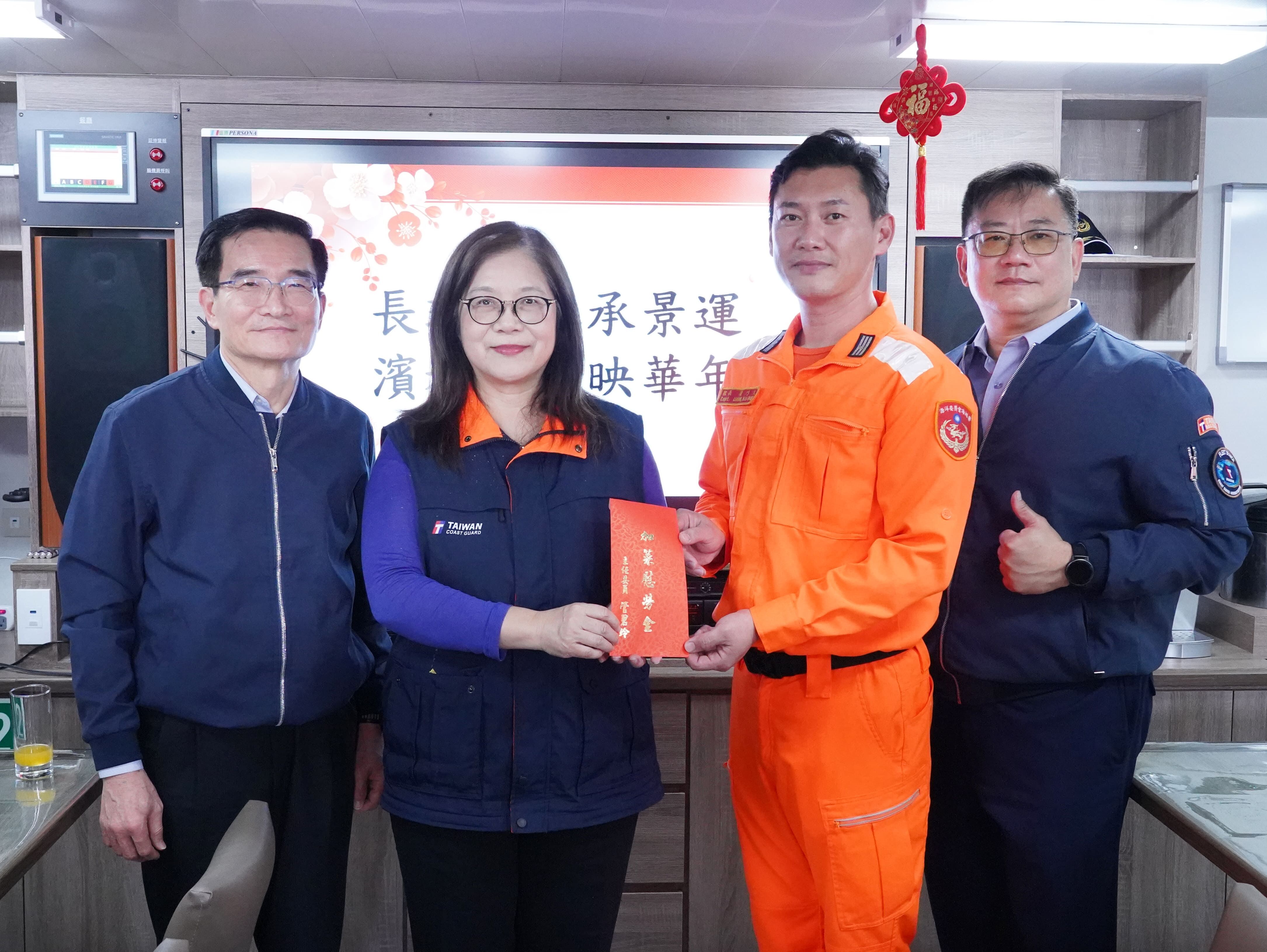 管碧玲主委也頒發加菜金給所有年節出勤的海巡艦艇代表,預祝全體海巡同仁新年快樂,她感性地說:『總統、院長和國人都知道海巡的辛苦;謝謝海巡守護國家!我有責任不斷地表達社會應該給予海巡的感謝』,管主委也藉此向全國各海巡之友、海巡志工、全體國人拜早年,祝福國人馬上幸福、馬上順利、馬到成功!