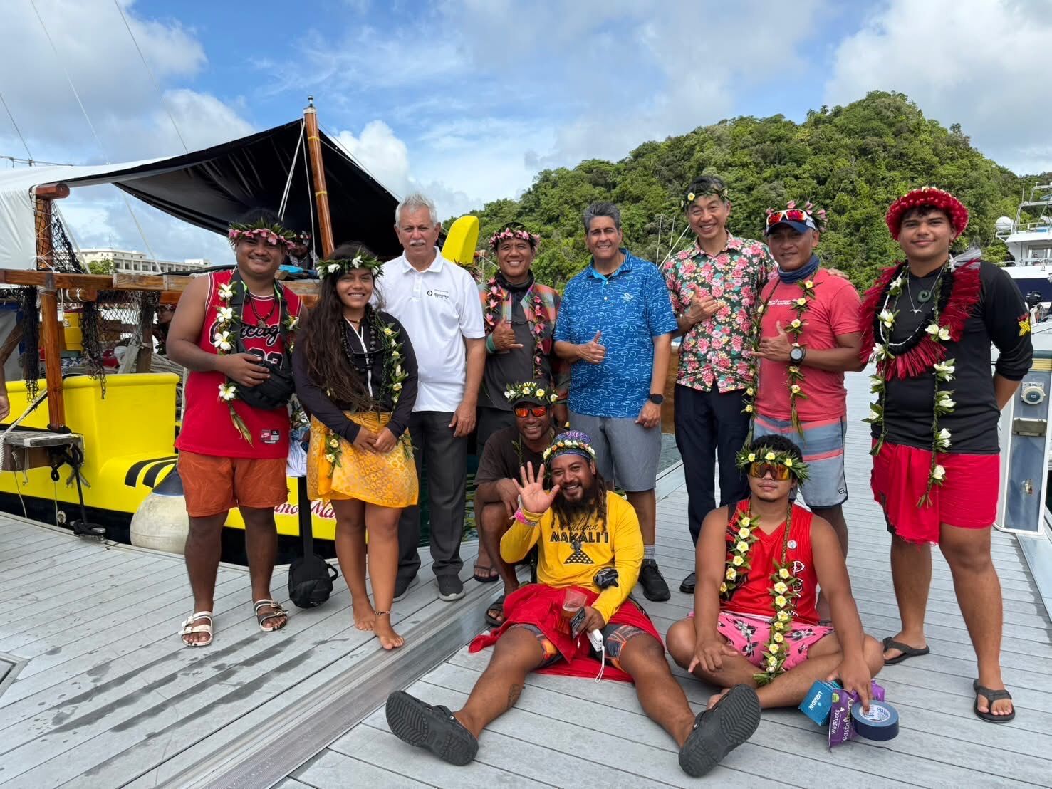 來自密克羅尼西亞聯邦雅浦州的航海大師Ali Haleyalur(後排右1)為船員主持傳統祝禱儀式