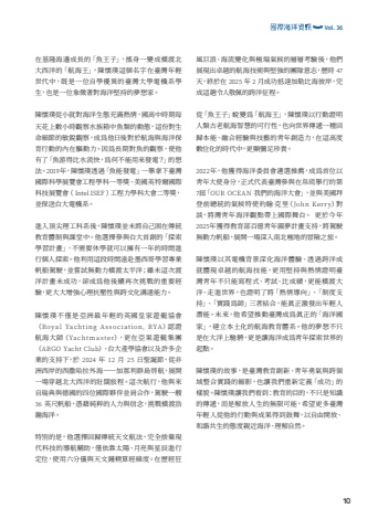 %u5728%u57fa%u9686%u6d77%u908a%u6210%u9577%u7684%u300c%u9b5a%u738b%u5b50%u300d%uff0c%u6416%u8eab%u4e00%u8b8a%u6210%u6a6b%u6e21%u5317%u5927%u897f%u6d0b%u7684%u300c%u822a%u6d77%u738b%u300d%uff0c%u9673%u61f7%u749e%u9019%u500b%u540d%u5b57%u5728%u81fa%u7063%u5e74%u8f15%u4e16%u4ee3%u4e2d%uff0c%u65e2%u662f%u4e00%u4f4d%u81ea%u5b78%u512a%u7570%u7684%u81fa%u7063%u5927%u5b78%u96fb%u6a5f%u7cfb%u5b78%u751f%uff0c%u4e5f%u662f%u4e00%u4f4d%u8c61%u5fb5%u8457%u5c0d%u6d77%u6d0b%u5805%u6301%u7684%u5922%u60f3%u5bb6%u3002%u9673%u61f7%u749e%u5f9e%u5c0f%u5c31%u5c0d%u6d77%u6d0b%u751f%u614b%u5145%u6eff%u71b1%u60c5%uff0c%u570b%u9ad8%u4e2d%u6642%u671f%u6bcf%u5929%u82b1%u4e0a%u6578%u5c0f%u6642%u89c0%u5bdf%u6c34%u65cf%u7bb1%u4e2d%u9b5a%u985e%u7684%u52d5%u614b%uff0c%u9019%u4efd%u5c0d%u751f%u547d%u7d30%u7bc0%u7684%u654f%u92b3%u89c0%u5bdf%uff0c%u6210%u70ba%u4ed6%u65e5%u5f8c%u5c0d%u65bc%u822a%u6d77%u8207%u6d77%u6d0b%u4fdd%u80b2%u884c%u52d5%u7684%u5167%u5728%u9a45%u52d5%u529b%u3002%u56e0%u70ba%u9577%u671f%u5c0d%u9b5a%u7684%u89c0%u5bdf%uff0c%u4f7f%u4ed6%u6709%u4e86%u300c%u9b5a%u6e38%u5f97%u6bd4%u6c34%u6d41%u5feb%uff0c%u70ba%u4f55%u4e0d%u80fd%u7528%u4f86%u767c%u96fb%uff1f%u300d%u7684%u60f3%u6cd5%u30022019%u5e74%uff0c%u9673%u61f7%u749e%u900f%u904e%u300c%u9b5a%u80fd%u767c%u96fb%u300d%u4e00%u64e7%u62ff%u4e0b%u81fa%u7063%u570b%u969b%u79d1%u5b78%u5c55%u89bd%u6703%u5de5%u7a0b%u5b78%u79d1%u4e00%u7b49%u734e%u3001%u7f8e%u570b%u82f1%u7279%u723e%u570b%u969b%u79d1%u6280%u5c55%u89bd%u6703%uff08 Intel ISEF %uff09%u5de5%u7a0b%u529b%u5b78%u79d1%u5927%u6703%u4e8c%u7b49%u734e%uff0c%u4e26%u4fdd%u9001%u53f0%u5927%u96fb%u6a5f%u7cfb%u3002%u9032%u5165%u9802%u5c16%u7406%u5de5%u79d1%u7cfb%u5f8c%uff0c%u9673%u61f7%u749e%u4e26%u672a%u5c07%u81ea%u5df1%u56f0%u5728%u50b3%u7d71%u6559%u80b2%u9ad4%u5236%u8207%u8ab2%u5802%u4e2d%u3002%u4ed6%u9078%u64c7%u53c3%u8207%u53f0%u5927%u9996%u5275%u7684%u300c%u63a2%u7d22%u5b78%u7fd2%u8a08%u756b%u300d%uff0c%u4e0d%u9700%u8981%u4f11%u5b78%u5c31%u53ef%u4ee5%u64c1%u6709%u4e00%u5e74%u7684%u6642%u9593%u9032%u884c%u500b%u4eba%u63a2%u7d22%u3002%u4ed6%u5229%u7528%u9019%u6bb5%u6642%u9593%u9060%u8d74%u58a8%u897f%u54e5%u5b78%u7fd2%u5c08%u696d%u5e06%u8239%u99d5%u99db%uff0c%u4e26%u5617%u8a66%u7121%u52d5%u529b%u6a6b%u6e21%u592a%u5e73%u6d0b%uff1b%u96d6%u672a%u9019%u6b21%u6e21%u6d0b%u8a08%u756b%u672a%u6210%u529f%uff0c%u537b%u6210%u70ba%u4ed6%u5f8c%u7e8c%u518d%u6b21%u6311%u6230%u7684%u91cd%u8981%u7d93%u9a57%uff0c%u66f4%u5927%u5927%u589e%u5f37%u5fc3%u7406%u6297%u58d3%u6027%u8207%u8de8%u6587%u5316%u6e9d%u901a%u80fd%u529b%u3002%u9673%u61f7%u749e%u4e0d%u50c5%u662f%u4e9e%u6d32%u6700%u5e74%u8f15%u7684%u82f1%u570b%u7687%u5bb6%u904a%u8247%u5354%u6703%uff08Royal Yachting Association, RYA%uff09%u8a8d%u8b49%u822a%u6d77%u5927%u5e2b%uff08Yachtmaster%uff09%uff0c%u66f4%u5728%u4e9e%u679c%u904a%u8247%u96c6%u5718%uff08ARGO Yacht Club%uff09%u3001%u53f0%u5927%u7522%u5b78%u5354%u6703%u4ee5%u53ca%u8a31%u591a%u4f01%u696d%u7684%u652f%u6301%u4e0b%uff0c%u65bc 2024 %u5e74 12 %u6708 25 %u65e5%u8056%u8a95%u7bc0%uff0c%u5f9e%u975e%u6d32%u897f%u5cb8%u7684%u897f%u6492%u54c8%u62c9%u5916%u6d77%uff0d%uff0d%u52a0%u90a3%u5229%u7fa4%u5cf6%u5553%u822a%uff0c%u5c55%u958b%u4e00%u5834%u7a7f%u8d8a%u5317%u5927%u897f%u6d0b%u7684%u58ef%u95ca%u65c5%u7a0b%u3002%u9019%u6b21%u822a%u884c%uff0c%u4ed6%u8207%u4f86%u81ea%u745e%u5178%u8207%u5fb7%u570b%u7684%u56db%u4f4d%u570b%u969b%u5925%u4f34%u4e26%u80a9%u5408%u4f5c%uff0c%u99d5%u99db%u4e00%u825836 %u82f1%u5c3a%u5e06%u8239%uff0c%u6191%u85c9%u7d14%u7cb9%u7684%u4eba%u529b%u8207%u4fe1%u5ff5%uff0c%u6311%u6230%u6a6b%u6e21%u6d69%u701a%u6d77%u6d0b%u3002%u7279%u5225%u7684%u662f%uff0c%u4ed6%u9078%u64c7%u56de%u6b78%u50b3%u7d71%u5929%u6587%u822a%u6cd5%uff0c%u5b8c%u5168%u6368%u68c4%u73fe%u4ee3%u79d1%u6280%u7684%u5c0e%u822a%u8f14%u52a9%uff0c%u50c5%u4f9d%u9760%u592a%u967d%u3001%u6708%u4eae%u8207%u661f%u8fb0%u9032%u884c%u5b9a%u4f4d%uff0c%u4f7f%u7528%u516d%u5206%u5100%u8207%u5929%u6587%u9418%u7cbe%u7b97%u7d93%u7def%u5ea6%u3002%u5728%u6b77%u7d93%u72c2%u98a8%u5de8%u6d6a%u3001%u6d77%u6d41%u8b8a%u5316%u8207%u6975%u7aef%u6c23%u5019%u7684%u5c64%u5c64%u8003%u9a57%u5f8c%uff0c%u4ed6%u5011%u5c55%u73fe%u51fa%u5353%u8d8a%u7684%u822a%u6d77%u6280%u8853%u8207%u5805%u5f37%u7684%u5718%u968a%u610f%u5fd7%uff0c%u6b77%u6642 47 %u5929%uff0c%u7d42%u65bc%u5728 2025 %u5e74 2 %u6708%u6210%u529f%u62b5%u9054%u52a0%u52d2%u6bd4%u6d77%u5f7c%u5cb8%uff0c%u5b8c%u6210%u9019%u8d9f%u4ee4%u4eba%u656c%u4f69%u7684%u8de8%u6d0b%u5f81%u7a0b%u3002%u5f9e%u300c%u9b5a%u738b%u5b50%u300d%u86fb%u8b8a%u70ba%u300c%u822a%u6d77%u738b%u300d%uff0c%u9673%u61f7%u749e%u4ee5%u884c%u52d5%u8b49%u660e%u4eba%u985e%u53e4%u8001%u822a%u6d77%u667a%u6167%u7684%u53ef%u884c%u6027%uff0c%u4e5f%u5411%u4e16%u754c%u50b3%u905e%u4e00%u7a2e%u56de%u6b78%u672c%u80fd%u3001%u878d%u5408%u7d93%u9a57%u8207%u6280%u85dd%u7684%u9751%u5e74%u5275%u9020%u529b%uff0c%u5728%u9019%u9ad8%u5ea6%u6578%u4f4d%u5316%u7684%u6642%u4ee3%u4e2d%uff0c%u66f4%u986f%u5f4c%u8db3%u73cd%u8cb4%u30022022%u5e74%uff0c%u4ed6%u7372%u5f97%u6d77%u6d0b%u59d4%u54e1%u6703%u9074%u9078%u63a8%u85a6%uff0c%u6210%u70ba%u9996%u4f4d%u4ee5%u9751%u5e74%u5927%u4f7f%u8eab%u5206%uff0c%u6b63%u5f0f%u4ee3%u8868%u81fa%u7063%u53c3%u8207%u5728%u5e1b%u7409%u64e7%u884c%u7684%u7b2c7%u5c46%u300cOUR OCEAN %u6211%u5011%u7684%u6d77%u6d0b%u5927%u6703%u300d%uff0c%u4e26%u8207%u7f8e%u570b%u62dc%u767b%u524d%u7e3d%u7d71%u7684%u6c23%u5019%u7279%u4f7f%u7d04%u7ff0%u00b7%u514b%u91cc%uff08John Kerry%uff09%u5c0d%u8ac7%uff0c%u5c07%u7063%u9751%u5e74%u6d77%u6d0b%u89c0%u9ede%u5e36%u4e0a%u570b%u969b%u821e%u53f0%u3002 %u66f4%u65bc%u4eca%u5e742025%u5e74%u7372%u5f97%u6559%u80b2%u90e8%u767e%u5104%u9751%u5e74%u5713%u5922%u8a08%u756b%u652f%u6301%uff0c%u5c07%u99d5%u99db%u7121%u52d5%u529b%u5e06%u8239%uff0c%u5c55%u958b%u4e00%u5834%u6df1%u5165%u5357%u5317%u6975%u5730%u7684%u5192%u96aa%u4e4b%u65c5%u3002%u9673%u61f7%u749e%u4ee5%u5176%u96fb%u6a5f%u80cc%u666f%u6df1%u5316%u6d77%u6d0b%u9ad4%u9a57%u3001%u900f%u904e%u8de8%u6d0b%u6210%u5c31%u9ad4%u73fe%u5353%u8d8a%u7684%u822a%u6d77%u6280%u80fd%uff0c%u66f4%u7528%u5805%u6301%u8207%u71b1%u60c5%u8b4