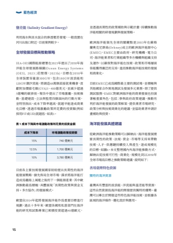 %u9e7d%u5dee%u80fd%uff08Salinity Gradient Energy%uff09%u5229%u7528%u6d77%u6c34%u8207%u6de1%u6c34%u6df7%u5408%u7684%u6ef2%u900f%u58d3%u5dee%u767c%u96fb%uff0c%u4e00%u822c%u8a2d%u7f6e%u5728%u6cb3%u5ddd%u51fa%u6d77%u53e3%u9644%u8fd1%uff0c%u76ee%u524d%u6848%u4f8b%u8f03%u5c11%u3002 %u5168%u7403%u767c%u5c55%u76ee%u6a19%u8207%u63a8%u52d5%u7b56%u7565IEA-OES%u570b%u969b%u80fd%u6e90%u7e3d%u7f72%u57282023%u5e74%u63d0%u51fa%u4e862050%u5e74%u6d77%u6d0b%u80fd%u5168%u7403%u767c%u5c55%u8def%u7dda%u5716(Ocean Energ y Systems (OES), 2023%uff1b%u838a%u9594%u5091%uff0c2023b)%uff0c%u76ee%u6a19%u57282050%u5e74%u5168%u7403%u88dd%u7f6e%u5bb9%u91cf%u9054300GW%uff0c%u5305%u542b180GW%u6ce2%u6d6a%u80fd%u548c120GW%u6f6e%u6c50%u6d41%u80fd%uff0c%u5c07%u5275%u902068%u842c%u500b%u76f4%u63a5%u5c31%u696d%u6a5f%u6703%uff0c%u8ca2%u737b%u9644%u52a0%u50f9%u5024%u6bdb%u984d(GVA)3%u3001400%u5104%u7f8e%u5143%uff0c%u4e26%u6e1b%u5c11%u8d85%u904e5%u5104%u5678%u7684%u78b3%u6392%u653e%u3002%u5831%u543f%u4e2d%u63d0%u51fa%u4e86%u5e02%u5834%u6fc0%u52f5%u3001%u6280%u8853%u63a8%u52d5%u3001%u57fa%u790e%u5efa%u8a2d%u3001%u7acb%u6cd5%u8207%u76e3%u7ba1%u56db%u500b%u9762%u5411%u7684%u884c%u52d5%u65b9%u6848%uff0c%u4e26%u7279%u5225%u6307%u51fa%uff0c%u6210%u672c%u4e0b%u964d%u7387%u8d8a%u9ad8%uff0c%u5c31%u8d8a%u65e9%u80fd%u9054%u6210%u5546%u696d%u5316%u76ee%u6a19%uff0c%u900f%u904e%u5e02%u5834%u6fc0%u52f5%u653f%u7b56%u6240%u82b1%u8cbb%u7684%u6295%u8cc7%u984d(%u4f8b%u5982%u63a1%u7528FiT%u6216CfD)%u5c31%u8d8a%u4f4e%uff0c%u5982%u88681%u3002%u76ee%u524d%u5404%u4e3b%u8981%u6280%u8853%u767c%u5c55%u570b%u5bb6%u7d1b%u7d1b%u63d0%u51fa%u9577%u671f%u6027%u7684%u6d77%u6d0b%u80fd%u767c%u5c55%u6230%u7565%uff0c%u6436%u5148%u4f48%u5c40%u5168%u7403%u5e02%u5834%uff0c%u8b00%u6c42%u5c07%u6d77%u6d0b%u80fd%u6253%u9020%u6210%u70ba%u7e7c%u6d77%u4e0a%u98a8%u96fb%u4e4b%u5f8c%u7684%u4e0b%u4e00%u500b%u80fd%u6e90%u7522%u696d%uff0c%u5176%u4e2d%u6b50%u6d32%u63a8%u52d5%u6700%u70ba%u7a4d%u6975%uff0c%u5177%u9ad4%u5c55%u73fe%u300c%u9577%u671f%u6027%u653f%u7b56%u8207%u8cc7%u91d1%u652f%u6301 + %u591a%u65b9%u5354%u4f5c%u300d%u7684%u767c%u5c55%u6a21%u5f0f%u3002%u6b50%u76df%u81ea2014%u5e74%u8d77%u5c07%u767c%u5c55%u6d77%u6d0b%u80fd%u4f5c%u70ba%u91cd%u8981%u76ee%u6a19%u9032%u884c%u898f%u5283%uff0c%u904e%u53bb%u5341%u591a%u5e74%u4f86%uff0c%u6b50%u76df%u5404%u570b%u548c%u79c1%u71df%u90e8%u9580%u5728%u6d77%u6d0b%u80fd%u7684%u7814%u7a76%u548c%u8a66%u9ede%u5c08%u6848%u5df2%u7d2f%u7a4d%u6295%u8cc7%u8d85%u904e40%u5104%u6b50%u5143%uff0c%u4e26%u900f%u904e%u9577%u671f%u6027%u7684%u653f%u7b56%u88dc%u52a9%u8207%u793a%u7bc4%u8a08%u756b%uff0c%u6301%u7e8c%u63a8%u52d5%u6d77%u6d0b%u80fd%u76f8%u95dc%u7684%u7814%u767c%u898f%u5283%u8207%u767c%u5c55%u7b56%u7565%u3002 %u6b50%u6d32%u6d77%u6d0b%u80fd%u9818%u5148%u5168%u7403%u7684%u95dc%u9375%u9ede%u662f2003%u5e74%u5728%u8607%u683c%u862d%u5967%u514b%u5c3c%u7fa4%u5cf6(Orkney)%u6210%u7acb%u7684%u6b50%u6d32%u6d77%u6d0b%u80fd%u6e90%u4e2d%u5fc3(EMEC)%uff0cEMEC%u4e3b%u8981%u7531%u653f%u5e9c%u3001%u7814%u7a76%u6a5f%u69cb%u3001%u96fb%u529b%u516c%u53f8%u3001%u6d77%u6d0b%u80fd%u696d%u8005%u548c%u884c%u696d%u7d44%u7e54%u7b49%u591a%u65b9%u6a5f%u69cb%u8207%u7d44%u7e54%u652f%u6301%u53ca%u904b%u4f5c%uff0c%u4ee5%u78ba%u4fdd%u5c0d%u6d77%u6d0b%u80fd%u5728%u6280%u8853%u3001%u653f%u7b56%u548c%u5e02%u5834%u5c64%u9762%u7686%u80fd%u7372%u5f97%u5ee3%u6cdb%u7684%u652f%u6301%uff0c%u9032%u800c%u63a8%u52d5%u6d77%u6d0b%u80fd%u6280%u8853%u7684%u767c%u5c55%u548c%u5546%u696d%u5316%u3002%u76ee%u524dEMEC%u5df2%u6210%u70ba%u570b%u969b%u6700%u4e3b%u8981%u7684%u6e2c%u8a66%u5834%uff0c%u4e26%u7a4d%u6975%u8207%u5176%u4ed6%u570b%u5bb6%u5408%u4f5c%u7570%u5730%u6e2c%u8a66%u53ca%u767c%u5c55%u591a%u5143%u696d%u52d9%u3002%u9664%u4e86%u63d0%u4f9b%u6e2c%u8a66%u670d%u52d9%uff0cEMEC%u5c0d%u6b50%u6d32%u6d77%u6d0b%u80fd%u7684%u5546%u696d%u767c%u5c55%u4e5f%u626e%u6f14%u8457%u6975%u91cd%u8981%u89d2%u8272%uff0c%u5305%u62ec%uff1a%u53c3%u8207%u653f%u5e9c%u653f%u7b56%u5efa%u8b70%uff0c%u63a8%u52d5%u6709%u5229%u65bc%u6d77%u6d0b%u80fd%u767c%u5c55%u7684%u653f%u7b56%u6846%u67b6%uff0c%u63d0%u4f9b%u696d%u8005%u5e02%u5834%u7814%u7a76%u3001%u653f%u7b56%u5206%u6790%u8207%u6280%u8853%u5546%u696d%u5316%u7684%u5efa%u8b70%uff0c%u4e26%u5354%u52a9%u696d%u8005%u7533%u8acb%u8a08%u756b%u88dc%u52a9%u8207%u6295%u8cc7%u3002%u6d77%u6d0b%u80fd%u767c%u5c55%u5177%u9ad4%u5efa%u8b70%u5f9e%u6b50%u6d32%u6d77%u6d0b%u80fd%u63a8%u52d5%u7b56%u7565%u53ef%u4ee5%u6b78%u7d0d%u51fa%uff0c%u6d77%u6d0b%u80fd%u767c%u5c55%u9700%u8981%u9577%u671f%u6027%u7684%u653f%u7b56%u3001%u6cd5%u898f%u3001%u8cc7%u91d1%u3001%u5e02%u5834%u7b49%u652f%u6301%u4f86%u5e36%u52d5%u6280%u8853%u3001%u4eba%u624d%u3001%u4f9b%u61c9%u93c8%u6301%u7e8c%u6295%u5165%u8207%u7522%u751f%uff0c%u9054%u6210%u898f%u6a21%u5316%u7684%u76ee%u6a19%uff0c%u5982%u57166%u3002%u672c%u6587%u6574%u7406%u570b%u5167%u5916%u6d77%u6d0b%u80fd%u63a8%u52d5%u65b9%u5f0f%uff0c%u6b78%u7d0d%u51fa%u5f9e%u6280%u8853%u53ef%u884c%u6027%u3001%u5546%u696d%u5316%u3001%u898f%u6a21%u5316%u5230%u4ee52050%u5e74%u5168%u7403%u5e02%u5834%u70ba%u76ee%u6a19%u4e4b%u63a8%u52d5%u7b56%u7565%u5efa%u8b70%uff0c%u8aaa%u660e%u5982%u4e0b%uff1a%u5584%u7528%u81fa%u7063%u7279%u8272%u8cc7%u6e90%u7368%u7279%u7684%u6d77%u6d0b%u8cc7%u6e90%u81fa%u7063%u5177%u6709%u8c50%u5bcc%u7684%u6ce2%u6d6a%u80fd%u3001%u6d0b%u6d41%u80fd%u8207%u6eab%u5dee%u80fd%u7b49%u8cc7%u6e90%uff0c%u9019%u4e9b%u81ea%u7136%u8cc7%u6e90%u70ba%u6d77%u6d0b%u80fd%u7684%u958b%u767c%u63d0%u4f9b%u7368%u7279%u7684%u512a%u52e2%u3002%u81fa%u7063%u53ef%u4ee5%u5c08%u6ce8%u65bc%u958b%u767c%u9019%u4e9b%u7279%u8272%u6d77%u6d0b%u80fd%u6280%u8853%uff0c%u4e26%u6839%u64da%u5404%u5340%u57df%u7684%u6d77%u6d0b%u689d%u4ef6%uff0c%u512a%u5316%u8a2d%u8a08%u8207%u61c9%u7528%u3002%u85cd%u8272%u7d93%u6fdf%u8868 1 %u6210%u672c%u4e0b%u964d%u8207%u5e02%u5834%u6fc0%u52f5%u653f%u7b56%u6240%u82b1%u8cbb%u7684%u6295%u8cc7%u91d1%u984d%u6210%u672c%u4e0b%u964d%u7387 %u5e02%u5834%u6fc0%u52f5%u653f%u7b56%u6295%u8cc7%u984d15% 740 %u5104%u7f8e%u514312.5% 1,700 %u5104%u7f8e%u514310% 3,780 %u5104%u7f8e%u514315