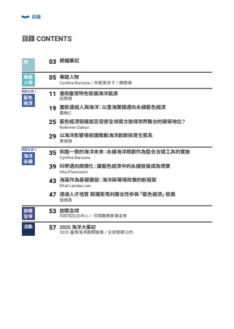 03 %u7e3d%u7de8%u7b46%u8a1805 %u5c08%u984c%u4eba%u7269Cynthia Barzuna / %u4e95%u690d%u7f8e%u5948%u5b50 / %u9673%u61f7%u749e11 %u5584%u7528%u81fa%u7063%u7279%u8272%u767c%u5c55%u6d77%u6d0b%u80fd%u6e90%u838a%u9594%u509119 %u91cd%u65b0%u9023%u7d50%u4eba%u8207%u6d77%u6d0b%uff1a%u4ee5%u91cc%u6d77%u5be6%u8e10%u9081%u5411%u6c38%u7e8c%u85cd%u8272%u7d93%u6fdf%u856d%u582f%u4ec125 %u85cd%u8272%u7d93%u6fdf%u767c%u5c55%u80fd%u5426%u4fc3%u4f7f%u5168%u7403%u5357%u65b9%u53d6%u5f97%u4e16%u754c%u821e%u53f0%u7684%u9818%u5c0e%u5730%u4f4d%uff1fRokhmin Dahuri29 %u4ee5%u6d77%u6d0b%u5f71%u97ff%u5c0e%u822a%u5100%u63a8%u52d5%u6d77%u6d0b%u5275%u65b0%u6295%u8cc7%u751f%u614b%u7cfb%u9ec3%u4fca%u63da35 %u548c%u8ae7%u4e00%u81f4%u7684%u6d77%u6d0b%u672a%u4f86%uff1a%u6c38%u7e8c%u6d77%u6d0b%u898f%u5283%u4f5c%u70ba%u6574%u5408%u6cbb%u7406%u5de5%u5177%u7684%u5be6%u65bdCynthia Barzuna39 %u79d1%u5b78%u9081%u5411%u898f%u6a21%u5316%uff1a%u8b93%u85cd%u8272%u7d93%u6fdf%u4e2d%u7684%u6c38%u7e8c%u767c%u5c55%u6210%u70ba%u73fe%u5be6Hila Ehrenreich43 %u6d77%u85fb%u4f5c%u70ba%u57fa%u790e%u5efa%u8a2d%uff1a%u6d77%u6d0b%u8207%u74b0%u5883%u653f%u7b56%u7684%u65b0%u6846%u67b6Efrat Landau Lev47 %u900f%u904e%u4eba%u624d%u57f9%u80b2 %u8ce6%u6b0a%u7d22%u99ac%u5229%u862d%u5973%u6027%u53c3%u8207%u300c%u85cd%u8272%u7d93%u6fdf%u300d%u767c%u5c55%u5f35%u7dba%u771f53 %u653e%u773c%u5168%u7403%u5370%u5c3c%u54c8%u6bd4%u6bd4%u4e2d%u5fc3 /%u00a0 %u5370%u5ea6%u89c0%u5bdf%u5bb6%u57fa%u91d1%u670357 2025 %u6d77%u6d0b%u5927%u4e8b%u7d002025 %u81fa%u7063%u6d77%u6d0b%u570b%u969b%u8ad6%u58c7 / %u5168%u7403%u5851%u81a0%u516c%u7d04%u76ee%u9304 CONTENTS%u76ee%u9304%u5e8f%u5c08%u984c%u4eba%u7269%u85cd%u8272%u7d93%u6fdf%u6d77%u6d0b%u6c38%u7e8c%u653e%u773c%u5168%u7403%u6d3b%u52d5%u95dc%u9375%u4e3b%u984c 1%u95dc%u9375%u4e3b%u984c 2