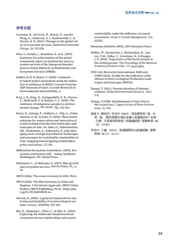 %u53c3%u8003%u6587%u737bCostanza, R., de Groot, R., Sutton, P., van der Ploeg, S., Anderson, S. J., Kubiszewski, I., & Turner, R. K. (2014). Changes in the global value of ecosystem services. Global Environmental Change, 26, 152-158. D%u00edaz, S., Settele, J., Brond%u00edzio, E. et al. (2019). Summary for policymakers of the global assessment report on biodiversity and ecosystem services of the Intergovernmental Science-Policy Platform on Biodiversity and Ecosystem Services (IPBES): Dublin, D. R. & Natori, Y. (2020). Community-based project assessment using the indicators of resilience in SEPLS: Lessons from the GEF-Satoyama Project. Current Research in Environmental Sustainability, 2. Ford, J. D., King, N., Galappaththi, E. K., Pearce, T., McDowell, G. & Harper, S. L. (2020). The resilience of indigenous peoples to environmental change. One Earth, 2(6), 532-543. Kozar, R., Galang, E., Sedhain, J., Alip, A., Subramanian, S. M., & Saito, O. (2020). Place-based solutions for conservation and restoration of social-ecological production landscapes and seascapes in Asia. In: Saito, O., Subramanian, SM., Hashimoto, S., Takeuuchi, K. (eds) Managing socio-ecological production landscapes and seascapes for sustainable communities in Asia: mapping and navigating stakeholders, policy and action, 117-146. Millennium Ecosystem Assessment. (2005). Ecosystems and human well%u2010 being: Synthesis. Washington, DC: Island Press. Mulazzani, L., & Malorgio, G. (2017). Blue growth and ecosystem services. Marine Policy, 85, 17-24. OECD (2016). The ocean economy in 2030, Paris. OECD (2024). The Blue Economy in Cities and Regions: A Territorial Approach, OECD Urban Studies, OECD Publishing, Paris, https://doi.org/10.1787/bd929b7d-en. Ostrom, E. (2009). A general framework for analyzing sustainability of social-ecological systems. Science, 325(5939), 419-422. Rui, D., Baiqiong L., Zhou, C., & Min, X., (2024). Exploring the multiscale island terrestrial ecosystem service relationships and coastal vulnerability under the infiuence of coastal ecosystems. Ocean & Coastal Management, 256, 107267. Satoyama Initiative (2024). GEF-Satoyama Project. Steffen, W., Rockstr%u00f6m, J., Richardson, K., Lenton, T.M., Folke, C., Liverman, D., & Donges, J. F. (2018). Trajectories of the Earth System in the Anthropocene. The Proceedings of the National Academy of Sciences USA, 115, 8252-8259. UNU-IAS, Bioversity International, IGES and UNDP (2014). Toolkit for the Indicators of Resilience in Socio-ecological Production Landscapes and Seascapes (SEPLS). Yanagi, T. (2011). Present situation of Satoumi creation. Global Environmental Research, 16(1), 3-8. Yanagi, T.(1998). Establishment of Sato-Umi in the coastal sea. J. Japan Society of Water Environment, 21, 703. %u5b6b%u590f%u5929%u3001%u984f%u4f4b%u4f03%u3001%u674e%u5149%u4e2d%uff082020%uff09%u3002%u71df%u9020%u97cc%u6027%u7684%u300c%u68ee - %u5ddd - %u91cc - %u6d77%u300d%uff1a%u97cc%u6027%u6307%u6a19%u5728%u5730%u5316%u4e26%u878d%u5165%u82b1%u84ee%u65b0%u793e%u6751%u300c%u793e%u6703- %u751f%u614b - %u751f%u7522%u5730%u666f%u8207%u6d77%u666f%u300d%u7684%u8abf%u9069%u7d93%u71df%u3002%u81fa%u7063%u6797%u696d%uff0c46%uff086%uff09%uff0c59-80%u3002%u674e%u5149%u4e2d%u3001%u738b%u946b %uff082015%uff09%u3002%u501f%u93e1%u570b%u969b%u91cc%u5c71%u5021%u8b70%u7d93%u9a57%u3002%u81fa%u7063%u6797%u696d%uff0c41%uff081%uff09%uff0c24-37%u3002Vol. 3624