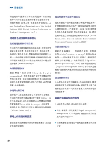 %u7279%u5225%u662f%u9751%u5e74%u5c31%u696d%u548c%u6cbf%u6d77%u793e%u5340%u7684%u5c31%u696d%u3002%u800c%u8a72%u9805%u7522%u696d%u4ea6%u53ef%u540c%u6642%u5728%u9078%u5b9a%u4e3b%u984c%u7684%u8a08%u756b%u4e0b%u4fc3%u9032%u6027%u5225%u5e73%u7b49%uff0c%u4f8b%u5982%u5728%u6f01%u696d%u3001%u6d77%u4e8b%u5de5%u696d%u3001%u6d77%u4e8b%u670d%u52d9%u7b49%u9818%u57df%uff08Food and Agriculture Organization of the United Nations, 2022; United Nations Conference on Trade and Development, 2023%uff09%u3002%u900f%u904e%u85cd%u8272%u7d93%u6fdf%u5be6%u73fe%u9818%u5c0e%u6f5b%u529b%u6c23%u5019%u8b8a%u9077%u884c%u52d5%u8207%u74b0%u5883%u7ba1%u7406%u5168%u7403%u5357%u65b9%u7684%u5404%u570b%u76f8%u8f03%u65bc%u5176%u4ed6%u5730%u5340%u4f86%u8aaa%uff0c%u975e%u5e38%u5bb9%u6613%u53d7%u5230%u6c23%u5019%u8b8a%u5316%u5f71%u97ff%uff0c%u50cf%u662f%u6d77%u5e73%u9762%u4e0a%u5347%u3001%u6d77%u6d0b%u9178%u5316%u7b49%u3002%u5404%u570b%u53ef%u4ee5%u85c9%u81ea%u8eab%u70ba%u4f8b%u3001%u5e36%u52d5%u5404%u7a2e%u6d77%u6d0b%u6c23%u5019%u89e3%u6c7a%u65b9%u6848%uff0d%uff0d%u4f8b%u5982%u85cd%u78b3%u751f%u614b%u7cfb%u7684%u5efa%u69cb%u3001%u7d05%u6a39%u6797%u7684%u5fa9%u80b2%u3001%u6d77%u6d0b%u4fdd%u8b77%u5340%u7684%u5283%u5b9a%u7b49%uff0d%uff0d%u85c9%u6b64%u5728%u6c23%u5019%u5916%u4ea4%u4e2d%u5efa%u7acb%u5176%u9053%u5fb7%u6b0a%u5a01%uff08moral authority%uff09%u3002%u77e5%u8b58%u8207%u6280%u8853%u5275%u65b0%u85c9 %u7531 %u589e %u52a0%u300c %u5357 %u5357 %u5408 %u4f5c%uff08 S o u t h - S o u t h cooperation%uff09%u300d%u548c%u591a%u908a%u7d44%u7e54%u7684%u652f%u6301%u7b49%u5404%u7a2e%u6d77%u6d0b%u79d1%u5b78%u548c%u6280%u8853%u6295%u8cc7%uff0c%u767c%u5c55%u4e2d%u570b%u5bb6%u5c07%u5f97%u4ee5%u5728%u6d77%u4e0a%u80fd%u6e90%u548c%u6c23%u5019%u97cc%u6027%u6c34%u7522%u990a%u6b96%u7b49%u9818%u57df%u751f%u7522%u81ea%u5df1%u7684%u8cc7%u6599%u3001%u5275%u9020%u77e5%u8b58%u7522%u6b0a%u3001%u4e26%u6301%u7e8c%u5275%u65b0%u3002%u591a%u908a%u5916%u4ea4%u8207%u6cbb%u7406%u7531%u65bc%u6d77%u6d0b%u5df2%u6210%u70ba%u5730%u7de3%u653f%u6cbb%u4ea4%u4e92%u7af6%u722d%u7684%u5168%u65b0%u6230%u7dda%uff0c%u5168%u7403%u5357%u65b9%u570b%u5bb6%u5c07%u53ef%u85c9%u7531%u74b0%u5370%u5ea6%u6d0b%u806f%u76df%uff08IORA%uff09%u3001%u592a%u5e73%u6d0b%u5cf6%u570b%u8ad6%u58c7%u3001%u4ee5%u53ca%u975e%u6d32%u806f%u76df2050%u6574%u9ad4%u6d77%u6d0b%u7b56%u7565%u7b49%u7b56%u7565%u806f%u76df%uff082050 AIM Strategy%uff09%uff0c%u5171%u540c%u767c%u8072%u3001%u9818%u5c0e%u5168%u4e16%u754c%uff0c%u5851%u9020%u51fa%u516c%u5e73%u4e14%u6c38%u7e8c%u7684%u6d77%u6d0b%u6cbb%u7406%u898f%u5247%uff08African Union, 2020%uff09%u3002%u9818%u5c0e%u529b%u7684%u95dc%u9375%u63a8%u52d5%u56e0%u7d20%u8981%u901a%u904e%u85cd%u8272%u7d93%u6fdf%u91cb%u653e%u5168%u7403%u5357%u65b9%u7684%u9818%u5c0e%u6f5b%u529b%uff0c%u5fc5%u9808%u6eff%u8db3%u5e7e%u500b%u8d77%u59cb%u689d%u4ef6%uff1a%u653f%u7b56%u6574%u9ad4%u6027%u8207%u5236%u5ea6%u6027%u7684%u5f37%u5316%u5f37%u6709%u529b%u7684%u6d77%u6d0b%u6cbb%u7406%u6846%u67b6%u548c%u6574%u5408%u6027%u6d77%u5cb8%u5730%u5340%u7ba1%u7406%uff0c%u662f%u5e36%u52d5%u9818%u5c0e%u529b%u7684%u57fa%u672c%u689d%u4ef6%u3002%u570b%u5bb6%u6d77%u6d0b%u653f%u7b56%u82e5%u80fd%u8207%u6c38%u7e8c%u767c%u5c55%u76ee%u6a19%u3001%u300a%u5df4%u9ece%u5354%u5b9a%u300b%u3001%u4ee5%u53ca%u300a%u6606%u660e-%u8499%u7279%u5a41%u5168%u7403%u751f%u7269%u591a%u6a23%u6027%u6846%u67b6%u300b%u7b49%u6cbb%u7406%u6846%u67b6%u9054%u6210%u4e00%u81f4%uff0c%u5c07%u53ef%u5728%u570b%u969b%u4e0a%u5efa%u7acb%u53ef%u4fe1%u5ea6%u4e26%u5438%u5f15%u570b%u5167%u5916%u7684%u6295%u8cc7%uff08World Bank, 2021; United Nations Env ironment Programme Finance Initiative, 2022%uff09%u3002%u6c38%u7e8c%u91d1%u878d%u8207%u6295%u8cc7%u5275%u65b0 %u7684%u91d1%u878d %u6a5f %u5236%uff0d%uff0d %u4f8b%u5982 %u85cd%u8272%u50b5%u5238%u3001%u50b5 %u52d9 %u63db%u81ea%u7136%uff08debt-for-nat ure swaps%uff09%u548c%u6df7%u5408%u6027%u91d1%u878d%u7b49%uff0d%uff0d%u53ef%u4ee5%u5f4c%u88dc%u8cc7%u672c%u6295%u5165%u7684%u7f3a%u53e3%u3002%u82e5%u8981%u71df%u9020%u570b%u969b%u4e0a%u7684%u9818%u5c0e%u80fd%u529b%uff0c%u516c%u79c1%u90e8%u9580%u5354%u529b%uff08publicprivate partnerships, PPP%uff09%u548c%u5340%u57df%u6027%u958b%u767c%u9280%u884c%uff08regional development banks%uff09%u7b49%u5408%u4f5c%u8207%u91d1%u878d%u6a5f%u5236%uff0c%u4e5f%u8981%u512a%u5148%u8003%u616e%u9ad8%u6210%u6548%u4e14%u4f4e%u751f%u614b%u98a8%u96aa%u7684%u85cd%u8272%u7d93%u6fdf%u9805%u76ee%u3002%u80fd%u529b%u5efa%u69cb%u8207%u6559%u80b2%u4eba%u529b%u8cc7%u672c%u7684%u767c%u5c55%u6709%u5176%u95dc%u9375%u6027%u3002%u7d93%u7531%u6d77%u6d0b%u6559%u80b2%u3001%u8077%u696d%u57f9%u8a13%u8207%u7814%u7a76%u5408%u4f5c%u7b49%u4e8b%u9805%u7684%u63a8%u52d5%uff0c%u5c07%u78ba%u4fdd%u5168%u7403%u5357%u65b9%u5404%u570b%u90fd%u80fd%u57f9%u80b2%u51fa%u65b0%u4e00%u4ee3%u7684%u6d77%u6d0b%u5c08%u696d%u4eba%u54e1%u8207%u653f%u7b56%u7b49%u9762%u5411%u7684%u9818%u5c0e%u8005%u3002%u9762%u81e8%u7684%u6311%u6230%u8207%u89e3%u6c7a%u7684%u7b56%u7565%u4e0a%u8ff0%u524d%u666f%u770b%u4f3c%u7f8e%u597d%uff0c%u537b%u4e5f%u5b58%u5728%u91cd%u5927%u6311%u6230%uff1a%u25cf %u975e%u6cd5%u3001%u672a%u5831%u543f%u3001%u4e0d%u53d7%u898f%u7bc4%uff08Illegal, unreported, unregulated; IUU%uff09%u7684%u6f01%u696d%uff1a%u9700%u8981%u5f37%u800c%u6709%u529b%u7684%u6d77%u4e0a%u5b89%u5168%u8207%u5171%u540c%u5408%u4f5c%u3002%u25cf %u6280%u8853%u8f49%u8b93%u58c1%u58d8%uff1a%u9700%u8981%u516c%u5e73%u7684%u77e5%u8b58%u7522%u6b0a%u9ad4%u7cfb%u8207%u4f01%u696d%u5408%u8cc7%u3002%u85cd%u8272%u7d93%u6fdf27