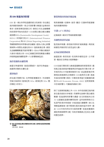 %u7528 OIN %u8861%u91cf%u6d77%u6d0b%u5f71%u97ffOIN %u662f%u4e00%u500b%u4ee5%u79d1%u5b78%u70ba%u57fa%u790e%u7684%u7d9c%u5408%u6027%u6846%u67b6%uff0c%u65e8%u5728%u6eff%u8db3%u6d77%u6d0b%u5275%u65b0%u9818%u57df%u5c0d%u4e00%u81f4%u4e14%u53ef%u4fe1%u5f71%u97ff%u529b%u8861%u91cf%u65e5%u76ca%u589e%u9577%u7684%u9700%u6c42%u3002%u8a72%u6846%u67b6%u5c08%u70ba%u65b0%u5275%u516c%u53f8%u3001%u5275%u6295%u516c%u53f8%u53ca%u91d1%u878d%u6a5f%u69cb%u7684%u6295%u8cc7%u53c3%u8003%u53d6%u5411%u800c%u8a2d%u8a08%u3002OIN%u662f%u6574%u5408%u806f%u5408%u570b%u6c38%u7e8c%u767c%u5c55%u6307%u6a19SDGs (Sustainable Development Goals)%u3001IRIS+2%u3001%u4e16%u754c%u9280%u884c%u7684IFC (International Finance Corporation) %u8207GRI (Global Reporting Initiative) %u7b49%u570b%u969b%u6a19%u6e96%u7684%u79d1%u5b78%u5c0e%u5411%u8a55%u4f30%u7db1%u9818%uff0c%u63d0%u4f9b6%u5927%u6838%u5fc3%u5f71%u97ff%u9818%u57df%u820734%u9805%u8cea%u5316%u6216%u91cf%u5316%u7684KPI%uff0c%u5354%u52a9%u65b0%u5275%u4f01%u696d%u3001%u5275%u6295%u53ca%u91d1%u878d%u6a5f%u69cb%u8861%u91cf%u5176%u6d77%u6d0b%u5f71%u97ff%u529b%u3002%u81ea2022%u5e74%u806f%u5408%u570b%u6d77%u6d0b%u5927%u6703%u9996%u6b21%u767c%u8868%u4ee5%u4f86%uff0cOIN%u5df2%u88ab%u5ee3%u6cdb%u63a1%u7528%u70ba%u8861%u91cf%u6c38%u7e8c%u6d77%u6d0b%u7d93%u6fdf%u9032%u5c55%u7684%u570b%u969b%u57fa%u6e96%u3002%u516d%u5927%u5f71%u97ff%u9818%u57df%u5305%u62ec%uff1a%u6d77%u6d0b%u8cc7%u6e90%u7684%u6c38%u7e8c%u7ba1%u7406%u6db5%u84cb%u751f%u7269%u91cf%u6062%u5fa9%u3001%u6d77%u7522%u6d6a%u8cbb%u6e1b%u5c11%u3001%u6d77%u6d0b%u751f%u7269%u798f%u7949%u3001%u6d77%u85fb%u8207%u8c9d%u985e%u7684%u6c38%u7e8c%u751f%u7522%u3002%u6f54%u6de8%u6d77%u6d0b%u8a55%u4f30%u6e1b%u5c11%u5851%u81a0%u6c59%u67d3%u3001%u5316%u5b78%u8207%u71df%u990a%u9e7d%u6d41%u5931%u3001%u5916%u4f86%u7a2e%u8207%u7a7a%u6c23%u6c61%u67d3%u6392%u653e%uff08%u6c2e%u6c27%u5316%u7269 NOx%u3001%u786b%u6c27%u5316%u7269 SOx%u3001%u61f8%u6d6e%u5fae%u7c92%uff09%u7684%u52aa%u529b%u3002%u7e41%u69ae%u8207%u5fa9%u80b2%u7684%u6d77%u6d0b%u68f2%u606f%u5730%u805a%u7126%u73ca%u745a%u7901%u3001%u7d05%u6a39%u6797%u3001%u6d77%u8349%u3001%u9e7d%u6cbc%u3001%u5de8%u85fb%u6797%u7b49%u91cd%u8981%u68f2%u5730%u7684%u4fdd%u8b77%u8207%u4fee%u5fa9%u3002%u5b88%u8b77 1.5%u00b0 C %u7684%u6c7a%u5fc3%u8a18%u9304%u6e1b%u6392%u3001%u78b3%u5c01%u5b58%u7b49%u6c23%u5019%u7de9%u89e3%u8ca2%u737b%u3002%u5177%u97cc%u6027%u7684%u6cbf%u5cb8%u793e%u5340%u76e3%u63a7%u6d77%u5cb8%u4fdd%u8b77%u3001%u5584%u7528%u6d77%u6d0b%u8cc7%u6599%u65bc%u6c23%u5019%u8abf%u9069%u3001%u8207%u56e0%u6c23%u5019%u97cc%u6027%u6240%u505a%u7684%u52aa%u529b%u800c%u53d7%u76ca%u7684%u4eba%u6578%u3002%u6b63%u5411%u793e%u6703%u7d93%u6fdf%u6210%u679c%u6db5%u84cb%u5c31%u696d%u3001%u6559%u80b2%u57f9%u8a13%u3001%u6027%u5225%u8207%u591a%u6a23%u6027%u5305%u5bb9%u3001%u516c%u5e73%u85aa%u8cc7%u3001%u7ce7%u98df%u5b89%u5168%u8207%u5730%u65b9%u7d93%u6fdf%u6a5f%u6703%u3002OIN%u4e5f%u80fd%u5f15%u5c0e%u6295%u8cc7%u4eba%u6aa2%u8996%u8d85%u8d8a%u5e33%u9762%u7684%u7d93%u71df%u8cc7%u8a0a%uff0c%u8b58%u5225%u771e%u6b63%u80fd%u6539%u5584%u6d77%u6d0b%u5065%u5eb7%u8207%u6cbf%u5cb8%u798f%u7949%u7684%u884c%u52d5%u65b9%u6848%u3002%u8a31%u591a%u73fe%u6709%u7684KPI%u53ef%u80fd%u5c0e%u81f4%u50b7%u5bb3%u884c%u70ba%uff0c%u6216%u9019%u50c5%u8457%u91cd%u65bc%u8207%u74b0%u5883%u6210%u679c%u812b%u7bc0%u7684%u4f01%u696d%u7e3e%u6548%u3002OIN%u80fd%u8207%u5176%u4e92%u88dc%uff0c%u900f%u904e%u591a%u9762%u5411%u7684%u5f71%u97ff%u529b%u5831%u543f%uff0c%u5f15%u5c0e%u6295%u8cc7%u8005%u9032%u884c%u66f4%u56b4%u8b39%u7684%u8abf%u67e5(World Economic Forum, 2022)%uff0c%u4e26%u5c07%u8cc7%u6e90%u96c6%u4e2d%u65bc%u9ad8%u5f71%u97ff%u529b%u3001%u53ef%u64f4%u5c55%u7684%u5275%u65b0%u65b9%u6848%u3002%u9664%u4e86%u652f%u63f4%u500b%u5225%u7d44%u7e54%u4e4b%u5916%uff0cOIN %u4ea6%u4f5c%u70ba%u66f4%u5ee3%u6cdb%u6d77%u6d0b%u5275%u65b0%u751f%u614b%u7cfb%u7d71%u7684%u5171%u4eab%u6846%u67b6%u3002%u5176%u6a19%u6e96%u5316%u6307%u6a19%u53ef%u6574%u5408%u7e3e%u6548%u6578%u64da%u3001%u4fc3%u9032%u900f%u660e%u7684%u5f71%u97ff%u529b%u6e9d%u901a%uff0c%u4e26%u652f%u6301%u767c%u5c55%u5177%u516c%u4fe1%u529b%u3001%u4ee5%u8b49%u64da%u70ba%u57fa%u790e%u7684%u8f49%u578b%u654d%u4e8b%u3002%u9019%u4e9b%u6d1e%u5bdf%u5c0d%u5438%u5f15%u516c%u79c1%u90e8%u9580%u6295%u8cc7%u975e%u5e38%u91cd%u8981%uff0c%u4ea6%u80fd%u900f%u904e%u51f8%u986f%u512a%u52e2%u3001%u7f3a%u53e3%u53ca%u7b56%u7565%u5354%u8abf%u9818%u57df%uff0c%u63d0%u5347%u6574%u500b%u751f%u614b%u7cfb%u7d71%u7684%u5354%u4f5c%u6548%u7387%u3002%u85c9%u6b64%uff0cOIN%u53ef%u7528%u65bc%u8a55%u4f30%u591a%u65b9%u9762%u7684%u5f71%u97ff%uff0c%u4fc3%u9032%u66f4%u56b4%u8b39%u7684%u8abf%u67e5%u8207%u8cc7%u6e90%u7cbe%u6e96%u5206%u914d%uff0c%u6709%u52a9%u65bc%u63a8%u52d5%u771e%u6b63%u5305%u5bb9%u4e14%u6c38%u7e8c%u7684%u85cd%u8272%u7d93%u6fdf%u3002%u85cd%u8272%u7d93%u6fdf%u5716 3 %u65e5%u65e5%u672c%u5bcc%u5c71%u7e23%u4ee5%u6df1%u5c64%u6d77%u6c34%u6de8%u5316%u751f%u8814 , %u63d0%u4f9b%u5b89%u5168%u53ca%u9ad8%u9644%u52a0%u50f9%u503c%u7684%u6d77%u7522%u8cc7%u6599%u4f86%u6e90%uff1a%u9ec3%u4fca%u63da31