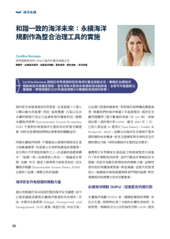 %u6d77%u6d0b%u662f%u5168%u7403%u6700%u91cd%u8981%u7684%u81ea%u7136%u8cc7%u7522%uff0c%u4e5f%u662f%u8d85%u904e%u4e09%u5341%u5104%u4eba%u53e3%u8cf4%u4ee5%u7dad%u751f%u7684%u57fa%u790e%u3002%u7136%u800c%uff0c%u6c23%u5019%u8b8a%u9077%u3001%u6c61%u67d3%u4ee5%u53ca%u975e%u6c38%u7e8c%u7684%u958b%u767c%u884c%u70ba%u6b63%u65e5%u76ca%u5a01%u8105%u6d77%u6d0b%u5065%u5eb7%u72c0%u6cc1%u3002%u63a8%u52d5%u6c38%u7e8c%u6d77%u6d0b%u7d93%u6fdf%uff08Sustainable Ocean Economy, SOE%uff09%u4e0d%u50c5%u5c0d%u65bc%u6062%u5fa9%u6d77%u6d0b%u751f%u614b%u7684%u826f%u597d%u72c0%u614b%u81f3%u95dc%u91cd%u8981%uff0c%u540c%u6642%u4e5f%u662f%u5be6%u73fe%u7d93%u6fdf%u8207%u793e%u6703%u7e41%u69ae%u7684%u95dc%u9375%u9014%u5f91%u3002 %u6240%u8b02%u6c38%u7e8c%u6d77%u6d0b%u7d93%u6fdf%uff0c%u4e0d%u50c5%u50c5%u662f%u4ee5%u8cc7%u6e90%u7684%u958b%u63a1%u6216%u751f%u7522%u529b%u70ba%u8861%u91cf%u6a19%u6e96%uff0c%u800c%u662f%u5efa%u7acb%u5728%u6211%u5011%u70ba%u5be6%u73fe%u9577%u671f%u7e41%u69ae%u3001%u5b89%u5168%u8207%u516c%u5e73%u6240%u71df%u9020%u7684%u689d%u4ef6%u4e4b%u4e0a%u3002%u5728%u9019%u6a23%u7684%u57fa%u790e%u67b6%u69cb%u4e2d%uff0c%u300c%u5354%u8abf%u4e00%u81f4%u300d%u626e%u6f14%u8457%u6838%u5fc3%u89d2%u8272%uff0d%uff0d%u7121%u8ad6%u662f%u5728%u7ba1%u7406%u3001%u91d1%u878d%u3001%u5916%u4ea4%uff0c%u9084%u662f%u4eba%u985e%u53c3%u8207%u65b9%u9762%u7686%u662f%u5982%u6b64%u3002%u800c%u6c38%u7e8c%u6d77%u6d0b%u898f%u5283%uff08Sustainable Ocean Plans, SOPs%uff09%u6b63%u63d0%u4f9b%u4e86%u9019%u6a23%u4e00%u500b%u6574%u5408%u6027%u7684%u57fa%u790e%u3002%u6d77%u6d0b%u5b89%u5168%u4f5c%u70ba%u767c%u5c55%u7684%u63a8%u52d5%u529b%u91cf%u904e%u53bb%u9577%u671f%u8655%u65bc%u5404%u81ea%u70ba%u653f%u72c0%u614b%u7684%u6d77%u6d0b%u5b89%u5168%u8b70%u984c%uff0c%u5982%u4eca%u5df2%u88ab%u666e%u904d%u8996%u70ba%u5be6%u73fe%u6c38%u7e8c%u6d77%u6d0b%u767c%u5c55%u7684%u5148%u6c7a%u689d%u4ef6%u3002%u975e%u6cd5%u3001%u672a%u5831%u543f%u53ca%u7121%u7ba1%u5236%uff08Illegal, Unreported, and Unregulated, IUU%uff09%u6f01%u696d%u3001%u6d77%u76dc%u884c%u70ba%u3001%u975e%u6cd5%u4ea4%u6613%uff0c%u4ee5%u53ca%u6e2f%u53e3%u8a2d%u65bd%u7684%u8106%u5f31%u6027%uff0c%u7686%u5c0d%u6d77%u6d0b%u7d93%u6fdf%u69cb%u6210%u56b4%u91cd%u5a01%u8105%u3002%u6839%u64da%u6211%u5011%u7684%u6d77%u6d0b%u6703%u8b70%u5341%u5e74%u9032%u5c55%u5831%u543f%uff0c%u6d77%u6d0b%u5b89%u5168%u96d6%u7136%u50c5%u7372%u5f97%u4e86%u6700%u5c11%u6578%u91cf%u7684%u627f%u8afe%uff08%u5171 215 %u9805%uff09%uff0c%u537b%u5c55%u73fe%u51fa%u7b2c%u4e8c%u9ad8%u7684%u57f7%u884c%u7387%uff0847%%uff09%uff0c%u622a%u81f3 2025 %u5e74 1 %u6708%uff0c%u5df2%u6295%u5165%u8cc7%u91d1%u9054 23 %u5104%u7f8e%u5143%uff08Lee-Emery%u3001Cuddy %uff06Pickerell, 2025%uff09%u3002%u9019%u986f%u793a%u51fa%u6d77%u6d0b%u5b89%u5168%u9818%u57df%u4e0d%u50c5%u5177%u5099%u660e%u78ba%u7684%u6210%u9577%u6a5f%u6703%uff0c%u66f4%u5177%u652f%u63f4%u570b%u5bb6%u8207%u5168%u7403%u7684%u5b89%u5168%u76ee%u6a19%u7684%u6f5b%u5728%u53ef%u80fd%uff0c%u540c%u6642%u56de%u61c9%u6d77%u6d0b%u751f%u614b%u7684%u8feb%u5207%u9700%u6c42%u3002%u81fa%u7063%u8207%u65e5%u672c%u7b49%u570b%u5bb6%u5728%u6d77%u5de1%u80fd%u529b%u8207%u6d77%u57df%u76e3%u63a7%u65b9%u9762%u9032%u884c%u4e86%u5177%u6709%u7b56%u7565%u6027%u7684%u6295%u8cc7%uff0c%u9019%u4e9b%u884c%u52d5%u4e26%u975e%u55ae%u7d14%u7684%u5b89%u5168%u63aa%u65bd%uff0c%u800c%u662f%u4f5c%u70ba%u85cd%u8272%u7d93%u6fdf%u6210%u9577%u7684%u63a8%u52d5%u529b%u91cf%u3002%u9019%u985e%u6295%u8cc7%u6709%u52a9%u65bc%u4fdd%u8b77%u6f01%u696d%u8cc7%u6e90%u3001%u964d%u4f4e%u98a8%u96aa%uff0c%u4e26%u63d0%u5347%u6295%u8cc7%u8005%u4fe1%u5fc3%uff0c%u5f37%u8abf%u6d77%u6d0b%u9818%u57df%u610f%u8b58%u8207%u8de8%u90e8%u9580%u9593%u7684%u5354%u8abf%uff0c%u5c0d%u65bc%u767c%u63ee%u6d77%u6d0b%u7d93%u6fdf%u6f5b%u529b%u800c%u8a00%u81f3%u95dc%u91cd%u8981%u3002%u6c38%u7e8c%u6d77%u6d0b%u898f%u5283%uff08SOPs%uff09%uff1a%u4fc3%u9032%u6574%u5408%u7684%u50ac%u5316%u5291%u6c38%u7e8c%u6d77%u6d0b%u898f%u5283%uff08SOPs%uff09%u662f%u4e00%u7a2e%u570b%u5bb6%u5c64%u7d1a%u7684%u7b56%u7565%uff0c%u65e8%u5728%u4ee5%u751f%u614b%u3001%u7d93%u6fdf%u8207%u793e%u6703%u4e09%u65b9%u9762%u7684%u6c38%u7e8c%u6027%u70ba%u539f%u5247%uff0c%u5168%u9762%u7ba1%u7406%u4e00%u500b%u570b%u5bb6%u767e%u5206%u4e4b%u767e%u7684%u6d77%u6d0b%u7a7a%u9593%u3002SOPs %u63d0%u4f9b%u548c%u8ae7%u4e00%u81f4%u7684%u6d77%u6d0b%u672a%u4f86%uff1a%u6c38%u7e8c%u6d77%u6d0b%u898f%u5283%u4f5c%u70ba%u6574%u5408%u6cbb%u7406%u5de5%u5177%u7684%u5be6%u65bd Cynthia Barzuna%u4e16%u754c%u8cc7%u6e90%u7814%u7a76%u6240%uff08WRI%uff09%u6d77%u6d0b%u8a08%u756b%u5168%u7403%u526f%u4e3b%u4efb%u95dc%u9375%u5b57%uff1a%u6c38%u7e8c%u6d77%u6d0b%u7d93%u6fdf%u3001%u6c38%u7e8c%u6d77%u6d0b%u898f%u5283%u3001%u85cd%u8272%u7d93%u6fdf%u3001%u85cd%u8272%u91d1%u878d %u3001%u6d77%u6d0b%u6cbb%u7406%u6d77%u6d0b%u6c38%u7e8cCynthia Barzuna %u70ba%u73fe%u4efb%u4e16%u754c%u8cc7%u6e90%u7814%u7a76%u6240%u6d77%u6d0b%u8a08%u756b%u5168%u7403%u526f%u4e3b%u4efb%uff0c%u5c08%u7cbe%u65bc%u6c38%u7e8c%u6d77%u6d0b%u898f%u5283%u8207%u6d77%u6d0b%u4fdd%u8b77%u5340%u7ba1%u7406%u3002%u66fe%u4efb%u54e5%u65af%u5927%u9ece%u52a0%u6c34%u8cc7%u6e90%u8207%u6d77%u6d0b%u526f%u90e8%u9577%u3001%u4e3b%u5c0e%u53ef%u53ef%u5cf6%u570b%u5bb6%u516c%u5712%u64f4%u5f35%uff0c%u5e36%u9818%u8a72%u570b%u65bc2021%u5e74%u9054%u6210%u4fdd%u8b7731%%u5c08%u5c6c%u7d93%u6fdf%u6d77%u57df%u7684%u76ee%u6a19%u3002 35