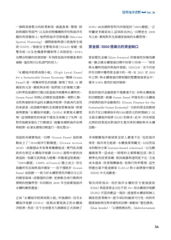 %u4e00%u500b%u8de8%u90e8%u6703%u6574%u5408%u7684%u653f%u7b56%u6846%u67b6%uff0c%u6db5%u84cb%u6f01%u696d%u3001%u74b0%u5883%u3001%u8ca1%u653f%u8207%u570b%u9632%u7b49%u90e8%u9580%uff0c%u4ee5%u53ca%u653f%u5e9c%u9593%u6a5f%u69cb%u8207%u6240%u6709%u8207%u6d77%u6d0b%u6709%u95dc%u7684%u5229%u5bb3%u95dc%u4fc2%u4eba%u3002%u4ed6%u5011%u5c07%u6d77%u6d0b%u7a7a%u9593%u898f%u5283%uff08Marine Spatial Planning%uff09%u3001%u570b%u969b%u8239%u8236%u8207%u6e2f%u53e3%u8a2d%u65bd%u4fdd%u5168%u898f%u5247%uff08ISPS%uff09%uff0f%u8239%u8236%u5b89%u5168%u8b66%u5831%u7cfb%u7d71%uff08SSAS%uff09%u898f%u7bc4%u3001%u9810%u8b66%u7cfb%u7d71%uff0c%u4ee5%u53ca%u5371%u6a5f%u61c9%u5c0d%u6a5f%u5236%u7b49%u5de5%u5177%u5236%u5ea6%u5316%u3002SOPs %u4e5f%u91cb%u51fa%u660e%u78ba%u7684%u6295%u8cc7%u8a0a%u865f%uff0c%u6709%u6548%u964d%u4f4e%u6d77%u6d0b%u76f8%u95dc%u7522%u696d%u7684%u98a8%u96aa%uff0c%u9032%u800c%u5438%u5f15%u516c%u79c1%u90e8%u9580%u7684%u6295%u5165%u3002 %u300c%u6c38%u7e8c%u6d77%u6d0b%u7d93%u6fdf%u9ad8%u968e%u5c0f%u7d44%u300d%uff08High Level Panel for a Sustainable Ocean Economy%uff0c%u7c21%u7a31 Ocean Panel%uff09%u662f%u4e00%u9805%u7368%u5177%u7279%u8272%u7684%u5021%u8b70%uff0c%u532f%u805a%u4e86%u4f86%u81ea 18 %u500b%u570b%u5bb6%u7684%u5143%u9996%u3001%u7e3d%u7d71%u8207%u9996%u76f8%uff0c%u4ed6%u5011%u81f4%u529b%u65bc%u63a8%u52d5%u5927%u81bd%u3001%u4ee5%u79d1%u5b78%u70ba%u57fa%u790e%u7684%u884c%u52d5%u4ee5%u4fc3%u9032%u6d77%u6d0b%u4fdd%u8b77%u8207%u6c38%u7e8c%u5229%u7528%u3002Ocean Panel %u7684%u6838%u5fc3%u76ee%u6a19%u662f%u52a0%u901f%u63a8%u52d5%u4e00%u500b%u5c0d%u4eba%u985e%u3001%u81ea%u7136%u8207%u6c23%u5019%u7686%u6709%u76ca%u7684%u6c38%u7e8c%u6d77%u6d0b%u7d93%u6fdf%u3002%u5176%u6700%u5177%u4ee3%u8868%u6027%u7684%u627f%u8afe%u662f%uff1a%u6210%u54e1%u570b%u6240%u8f44%u7684%u5168%u90e8%u570b%u5bb6%u7ba1%u8f44%u6d77%u57df%uff0c%u5c07%u767c%u5c55%u8207%u5be6%u65bd%u300c%u6c38%u7e8c%u6d77%u6d0b%u898f%u5283%u300d%uff08SOPs%uff09%u4f86%u5be6%u73fe%u6c38%u7e8c%u7ba1%u7406%u3002%u9019%u9805%u958b%u5275%u6027%u7684%u627f%u8afe%u4e0d%u50c5%u70ba%u5168%u7403%u6a39%u7acb%u4e86%u5148%u4f8b%uff0c%u4e5f%u5c0d%u5176%u4ed6%u570b%u5bb6%u767c%u51fa%u4e86%u884c%u52d5%u865f%u53ec%uff0c%u9f13%u52f5%u5404%u570b%u5c07%u6d77%u6d0b%u6cbb%u7406%u8207%u7d93%u6fdf%u3001%u793e%u6703%u53ca%u74b0%u5883%u76ee%u6a19%u9032%u884c%u4e00%u81f4%u5316%u6574%u5408%u3002%u70ba%u5354%u52a9%u5404%u570b%u5be6%u73fe%u6b64%u4e00%u76ee%u6a19%uff0cOcean Panel %u5354%u52a9%u63a8%u52d5%u6210%u7acb%u4e86%u300c2030%u6d77%u6d0b%u884c%u52d5%u806f%u76df%u300d%uff08Ocean Action 2030%uff09%uff0c%u8a72%u806f%u76df%u7531%u591a%u5bb6%u5c08%u696d%u6a5f%u69cb%u7d44%u6210%uff0c%u5c08%u9580%u70ba%u5404%u570b%u653f%u5e9c%u5728%u5236%u5b9a%u6c38%u7e8c%u6d77%u6d0b%u898f%u5283%uff08SOPs%uff09%u904e%u7a0b%u4e2d%u63d0%u4f9b%u6280%u8853%u5354%u52a9%u3001%u77e5%u8b58%u4ea4%u6d41%u8207%u80fd%u529b%u5efa%u69cb%u3002%u4f34%u96a8%u8457%u9019%u80a1%u52d5%u80fd%uff0c%u300c100%%u806f%u76df%u300d%uff08100% Alliance%uff09%u96a8%u4e4b%u6210%u7acb%uff0c%u65e8%u5728%u9f13%u52f5%u6240%u6709%u6cbf%u6d77%u8207%u6d77%u6d0b%u570b%u5bb6%uff0d%uff0d%u800c%u4e0d%u50c5%u9650%u65bc Ocean Panel %u6210%u54e1%u570b%uff0d%uff0d%u81f4%u529b%u65bc%u6c38%u7e8c%u7ba1%u7406%u5176%u6240%u8f44%u767e%u5206%u4e4b%u767e%u7684%u570b%u5bb6%u6d77%u57df%u3002%u8a72%u806f%u76df%u7684%u76ee%u6a19%uff0c%u662f%u63a8%u52d5%u5168%u7403%u884c%u52d5%u8207%u540c%u5115%u9593%u7684%u7d93%u9a57%u5b78%u7fd2%uff0c%u5171%u540c%u671d%u5411 2030 %u5e74%u5168%u9762%u5be6%u73fe%u6d77%u6d0b%u6c38%u7e8c%u7684%u9858%u666f%u9081%u9032%u3002%u6b63%u5982%u300c%u6c38%u7e8c%u6d77%u6d0b%u7d93%u6fdf%u9ad8%u968e%u5c0f%u7d44%u300d%u6240%u5f37%u8abf%u7684%uff0c%u6c92%u6709%u6c38%u7e8c%u6d77%u6d0b%u898f%u5283%uff08SOPs%uff09%uff0c%u5c31%u7121%u6cd5%u5be6%u73fe%u771e%u6b63%u7684%u6c38%u7e8c%u6d77%u6d0b%u7d93%u6fdf%u3002%u7136%u800c%uff0c%u81f3%u4eca%u5168%u7403%u50c5%u6709%u4e5d%u500b%u570b%u5bb6%u6b63%u5f0f%u63a1%u7d0d%u4e86SOPs%u3002%u7531%u6cd5%u570b%u8207%u667a%u5229%u5171%u540c%u767c%u8d77%u7684%u300c100%%u806f%u76df%u300d%uff0c%u6b63%u547c%u7c72%u66f4%u591a%u570b%u5bb6%u52a0%u5165%u9019%u9805%u653f%u6cbb%u6c7a%u5fc3%uff0c%u76ee%u6a19%u662f%u5728 2030 %u5e74%u4e4b%u524d%uff0c%u5be6%u73fe%u5c0d%u5176%u5168%u90e8%u570b%u5bb6%u6d77%u57df%u7684%u6c38%u7e8c%u7ba1%u7406%u3002%u8cc7%u91d1%u9762%uff1a5500 %u5104%u7f8e%u5143%u7684%u8cc7%u91d1%u7f3a%u53e3%u7576%u524d%u85cd%u8272%u91d1%u878d%uff08blue finance%uff09%u7684%u767c%u5c55%u72c0%u6cc1%u6975%u70ba%u56b4%u5cfb%u3002%u806f%u5408%u570b%u6c38%u7e8c%u767c%u5c55%u76ee%u6a19%u4e2d%u7684%u7b2c%u5341%u56db%u9805%uff0d%uff0d%u300c%u4fdd%u80b2%u8207%u6c38%u7e8c%u5229%u7528%u6d77%u6d0b%u8207%u6d77%u6d0b%u8cc7%u6e90%u300d%uff08SDG14%uff09%uff0c%u81f3%u4eca%u4ecd%u662f%u6240%u6709%u76ee%u6a19%u4e2d%u7372%u5f97%u8cc7%u91d1%u6700%u5c11%u7684%u4e00%u9805%u3002%u5728 2015 %u81f3 2019 %u5e74%u4e4b%u9593%uff0c%u8207%u6c38%u7e8c%u767c%u5c55%u76ee%u6a19%u76f8%u95dc%u7684%u6574%u9ad4%u767c%u5c55%u8cc7%u91d1%u4e2d%uff0c%u50c5%u6709 0.01% %u88ab%u7528%u65bc%u6d77%u6d0b%u9818%u57df%u3002%u7576%u524d%u7684%u6d77%u6d0b%u91d1%u878d%u8cc7%u6e90%u4e0d%u50c5%u56b4%u91cd%u4e0d%u8db3%uff0c%u4ea6%u8207%u6c38%u7e8c%u767c%u5c55%u7684%u76ee%u6a19%u812b%u7bc0%u3002%u6839%u64da Ocean Panel %u6240%u767c%u5e03%u7684%u300a%u6c38%u7e8c%u6d77%u6d0b%u7d93%u6fdf%u7684%u6d77%u6d0b%u91d1%u878d%u5831%u543f%u300b%uff08Ocean Finance for the Sustainable Ocean Economy%uff09%uff0c%u76ee%u524d%u7684%u8cc7%u91d1%u6d41%u52d5%u9810%u4f30%u4ecd%u4e0d%u8db3%u4ee5%u5861%u88dc%u6bcf%u5e74%u7d045500%u5104%u7f8e%u5143%u7684%u8ca1%u52d9%u7f3a%u53e3%uff0c%u4ee5%u652f%u63f4%u6c38%u7e8c%u6d77%u6d0b%u7d93%u6fdf%uff08SOE%uff09%u7684%u9700%u6c42%u3002%u6b64%u5916%uff0c%u4ecd%u6709%u76f8%u7576%u6bd4%u4f8b%u7684%u6295%u8cc7%u6d41%u5411%u5c0d%u6d77%u6d0b%u751f%u614b%u6709%u5bb3%u7684%u88dc%u8cbc%u8207%u975e%u6c38%u7e8c%u6d3b%u52d5%u3002%u591a%u9805%u95dc%u9375%u6d77%u6d0b%u9818%u57df%u8cc7%u91d1%u6295%u5165%u56b4%u91cd%u4e0d%u8db3%uff0c%u5305%u62ec%u6d77%u6d0b%u4fdd%u80b2%u3001%u