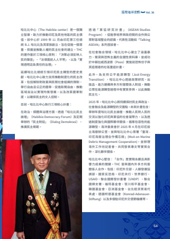 %u54c8%u6bd4%u6bd4%u4e2d%u5fc3%uff08The Habibie center%uff09%u662f%u4e00%u500b%u7368%u7acb%u667a%u5eab%uff0c%u81f4%u529b%u65bc%u63a8%u52d5%u5370%u5c3c%u53ca%u5176%u4ed6%u5730%u5340%u7684%u6c11%u4e3b%u50f9%u503c%u3002%u8a72%u4e2d%u5fc3%u65bc 1999 %u5e74 11 %u6708%u7531%u5370%u5c3c%u7b2c%u4e09%u4efb%u7e3d%u7d71 B.J. %u54c8%u6bd4%u6bd4%u53ca%u5176%u5bb6%u65cf%u5275%u7acb%uff0c%u65e8%u5728%u4fc3%u9032%u4e00%u500b%u5c0a%u91cd%u3001%u4fdd%u8b77%u4e26%u63a8%u52d5%u4eba%u6b0a%u7684%u6c11%u4e3b%u793e%u6703%u7684%u5efa%u7acb%u3002THC %u7684%u904b%u4f5c%u57fa%u65bc%u4e09%u9805%u6838%u5fc3%u539f%u5247%uff1a%u300c%u6c7a%u7b56%u5fc5%u9808%u53cd%u6620%u4eba%u6c11%u7684%u8072%u97f3%u300d%u3001%u300c%u6cd5%u5f8b%u9762%u524d%u4eba%u4eba%u5e73%u7b49%u300d%uff0c%u4ee5%u53ca%u300c%u5be6%u73fe%u900f%u660e%u4e14%u8ca0%u8cac%u4efb%u7684%u6cbb%u7406%u300d%u3002%u5ef6%u7e8c%u54c8%u6bd4%u6bd4%u7e3d%u7d71%u5f15%u9818%u5370%u5c3c%u6c11%u4e3b%u8f49%u578b%u7684%u6b77%u53f2%u8ca2%u737b%uff0c%u54c8%u6bd4%u6bd4%u4e2d%u5fc3%u81f4%u529b%u652f%u6301%u63a8%u52d5%u5236%u5ea6%u5316%u7684%u6c11%u4e3b%u6539%u9769%uff0c%u5305%u62ec%u89e3%u9664%u5c0d%u653f%u9ee8%u8207%u6c11%u9593%u793e%u6703%u7d44%u7e54%u7684%u9650%u5236%u3001%u8209%u884c%u81ea%u7531%u4e14%u516c%u6b63%u7684%u9078%u8209%u3001%u4fc3%u9032%u65b0%u805e%u81ea%u7531%u3001%u63a8%u52d5%u5340%u57df%u81ea%u6cbb%u4ee5%u5be6%u73fe%u5747%u8861%u767c%u5c55%uff0c%u4ee5%u53ca%u6539%u9769%u570b%u8ecd%u5236%u5ea6%uff0c%u4ee5%u78ba%u4fdd%u6c11%u4e3b%u7684%u6587%u4eba%u63a7%u5236%u3002%u76ee%u524d%uff0c%u54c8%u6bd4%u6bd4%u4e2d%u5fc3%u57f7%u884c%u4e09%u9805%u6838%u5fc3%u8a08%u756b%uff1a%u5728%u653f%u6cbb%u3001%u5a92%u9ad4%u8207%u6cbb%u7406%u65b9%u9762%uff0c%u900f%u904e%u300c%u54c8%u6bd4%u6bd4%u6c11%u4e3b%u8ad6%u58c7%u300d%uff08Habibie Democracy Forum%uff09%u53ca%u5b9a%u671f%u8209%u8fa6%u7684%u300c%u6c11%u4e3b%u5c0d%u8a71%u300d%uff08Dialog Demokrasi%uff09%uff0c%u63a8%u5ee3%u6c11%u4e3b%u898f%u7bc4%u3002%u900f %u904e%u300c %u6771 %u5354 %u7814 %u7a76 %u8a08 %u756b %u300d%uff08ASEAN Studies Program%uff09%uff0c%u4fc3%u9032%u5b78%u8853%u754c%u8207%u653f%u5e9c%u9593%u7684%u5408%u4f5c%u8207%u516c%u773e%u5c0d%u5340%u57df%u6574%u5408%u7684%u8a8d%u8b58%uff0c%u4ee3%u8868%u6027%u6d3b%u52d5%u5982%u300cTalking ASEAN%u300d%u7cfb%u5217%u5ea7%u8ac7%u6703%u3002%u5728%u793e%u6703%u878d%u5408%u9818%u57df%uff0c%u54c8%u6bd4%u6bd4%u4e2d%u5fc3%u5efa%u7acb%u4e86%u6db5%u84cb%u66b4%u529b%u3001%u885d%u7a81%u8207%u6050%u6016%u4e3b%u7fa9%u7684%u5168%u570b%u6027%u8cc7%u6599%u5eab%uff0c%u4e26%u6210%u529f%u65bc%u4e2d%u8607%u62c9%u5a01%u897f%u6ce2%u7d22%uff08Poso%uff09%u5be6%u65bd%u524d%u6050%u6016%u4efd%u5b50%u8207%u5176%u8ffd%u96a8%u8005%u7684%u793e%u5340%u91cd%u8fd4%u8a08%u756b%u3002%u6b64 %u5916%uff0c %u70ba %u652f %u6301 %u516c %u5e73 %u80fd %u6e90 %u8f49 %u578b%uff08Just Energy Transition%uff09%uff0c%u54c8%u6bd4%u6bd4%u4e2d%u5fc3%u900f%u904e%u653f%u7b56%u7814%u7a76%u3001%u51fa%u7248%u54c1%u3001%u80fd%u529b%u5efa%u69cb%u8207%u591a%u65b9%u5229%u5bb3%u95dc%u4fc2%u4eba%u5c0d%u8a71%uff0c%u63a8%u52d5%u516c%u773e%u5728%u80fd%u6e90%u8f49%u578b%u904e%u7a0b%u4e2d%u6709%u5be6%u8cea%u53c3%u8207%uff0c%u4ee5%u6b64%u63a8%u52d5%u6c11%u4e3b%u5316%u30022025 %u5e74%uff0c%u54c8%u6bd4%u6bd4%u4e2d%u5fc3%u5c07%u6301%u7e8c%u63a2%u8a0e%u6c11%u4e3b%u8207%u653f%u6cbb%u3001%u793e%u6703%u878d%u5408%u53ca%u80fd%u6e90%u8f49%u578b%u7684%u4ea4%u532f%u9ede%u3002%u672a%u4f86%u8a08%u756b%u5305%u542b%uff1a%u8209%u8fa6%u5e74%u5ea6%u54c8%u6bd4%u6bd4%u6c11%u4e3b%u8ad6%u58c7%u3001%u63a8%u52d5%u4eba%u6c11%u5c0d%u4eba%u6c11%u7684%u4ea4%u6d41%u4ee5%u5f37%u5316%u5370%u5c3c%u8207%u6771%u5354%u7684%u793e%u6703%u51dd%u805a%u529b%uff0c%u4ee5%u53ca%u900f%u904e%u5236%u5ea6%u5f37%u5316%u8207%u570b%u969b%u5925%u4f34%u95dc%u4fc2%uff0c%u5021%u5c0e%u5305%u5bb9%u6027%u7684%u80fd%u6e90%u8f49%u578b%u3002%u6d77%u6d0b%u59d4%u54e1%u6703%u65bc 2025 %u5e74 4 %u6708%u5728%u5370%u5c3c%u8a2d%u7acb%u6d77%u5ee2%u8fa6%u516c%u5ba4%uff0c%u4e26%u8207%u54c8%u6bd4%u6bd4%u4e2d%u5fc3%u7c3d%u7f72%u300c%u81fa%u7063 -%u5370%u5c3c%u6d77%u5ee2%u6cbb%u7406%u5408%u4f5c%u5099%u5fd8%u9304%u300d(MoA on Marine Debris Management Cooperation)%uff0c%u4e26%u8fa6%u7406%u6d77%u5916%u5de5%u4f5c%u574a%u8a18%u8005%u6703%u3001%u5171%u540c%u767c%u8868%u5c08%u6587%u7b49%u5be6%u8cea%u5408%u4f5c%uff0c%u6df1%u5316%u5925%u4f34%u95dc%u4fc2%u3002%u54c8%u6bd4%u6bd4%u4e2d%u5fc3%u5805%u4fe1%uff1a%u300c%u5408%u4f5c%u300d%u662f%u5be6%u73fe%u6c38%u7e8c%u4e14%u5177%u5f71%u97ff%u529b%u6210%u679c%u7684%u95dc%u9375%u3002THC %u66fe%u8207%u570b%u5167%u5916%u591a%u65b9%u5229%u5bb3%u95dc%u4fc2%u4eba%u5408%u4f5c%uff0c%u5305%u62ec%uff1a%u5370%u5c3c%u5916%u4ea4%u90e8%u3001%u4eba%u985e%u767c%u5c55%u5354%u8abf%u90e8%u3001%u570b%u5bb6%u53cd%u6050%u5c40%u3001%u5370%u5c3c%u592e%u884c%u3001%u4e16%u754c%u9280%u884c%u3001USAID%u3001%u806f%u5408%u570b%u958b%u767c%u8a08%u756b%u7f72%uff08UNDP%uff09%u3001%u806f%u5408%u570b%u5a66%u5973%u7f72%u3001%u798f%u7279%u57fa%u91d1%u6703%u3001%u7b39%u5ddd%u548c%u5e73%u57fa%u91d1%u6703%u3001%u97d3%u570b%u57fa%u91d1%u6703%u3001%u4e9e%u6d32%u57fa%u91d1%u6703%u3001%u53f0%u5317%u7d93%u6fdf%u8cbf%u6613%u4ee3%u8868%u8655%u3001%u5fb7%u570b%u67ef%u5fb7%u57fa%u91d1%u6703%uff08Konrad-AdenauerStiftung%uff09%u4ee5%u53ca%u591a%u500b%u99d0%u5370%u5c3c%u5916%u4ea4%u4f7f%u7bc0%u6a5f%u69cb%u7b49%u3002Vol. 3654