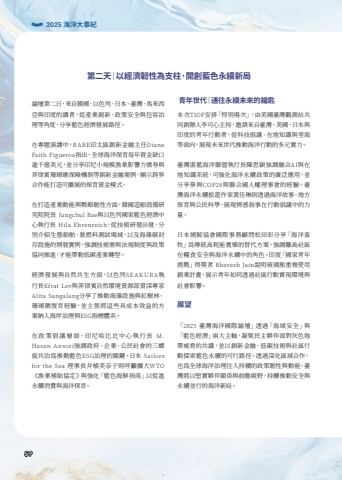 %u8ad6%u58c7%u7b2c%u4e8c%u65e5%uff0c%u4f86%u81ea%u97d3%u570b%u3001%u4ee5%u8272%u5217%u3001%u65e5%u672c%u3001%u81fa%u7063%u3001%u99ac%u4f86%u897f%u4e9e%u8207%u5370%u5ea6%u7684%u8b1b%u8005%uff0c%u5f9e%u7522%u696d%u5275%u65b0%u3001%u653f%u7b56%u5b89%u5168%u8207%u5305%u5bb9%u6cbb%u7406%u7b49%u89d2%u5ea6%uff0c%u5206%u4eab%u85cd%u8272%u7d93%u6fdf%u767c%u5c55%u8def%u5f91%u3002%u5728%u5c08%u984c%u6f14%u8b1b%u4e2d%uff0cRARE%u5370%u592a%u5340%u5275%u65b0%u91d1%u878d%u4e3b%u4efbDiane Faith Figueroa%u6307%u51fa%uff0c%u5168%u7403%u6d77%u6d0b%u4fdd%u80b2%u6bcf%u5e74%u8cc7%u91d1%u7f3a%u53e3%u903e%u5343%u5104%u7f8e%u5143%uff0c%u4e26%u5206%u4eab%u5370%u5c3c%u5c0f%u898f%u6a21%u6f01%u696d%u5f71%u97ff%u529b%u50b5%u5238%u8207%u83f2%u5f8b%u8cd3%u73ca%u745a%u7901%u4fdd%u96aa%u6a5f%u5236%u7b49%u5275%u65b0%u91d1%u878d%u6848%u4f8b%uff0c%u986f%u793a%u8de8%u754c%u5408%u4f5c%u80fd%u6253%u9020%u53ef%u64f4%u5c55%u7684%u4fdd%u80b2%u8cc7%u91d1%u6a21%u5f0f%u3002%u5728%u6253%u9020%u7522%u696d%u52d5%u80fd%u8207%u6230%u7565%u97cc%u6027%u65b9%u9762%uff0c%u97d3%u570b%u9020%u8239%u8a2d%u5099%u7814%u7a76%u9662%u9662%u9577 Jungchul Bae%u8207%u4ee5%u8272%u5217%u570b%u5bb6%u85cd%u8272%u7d93%u6fdf%u4e2d%u5fc3%u57f7%u884c%u9577 Hila Ehrenreich%uff0c%u5f9e%u6280%u8853%u7814%u767c%u51fa%u767c%uff0c%u5206%u5225%u4ecb%u7d39%u751f%u614b%u8239%u8236%u3001%u6c28%u71c3%u6599%u6e2c%u8a66%u5834%u57df%uff0c%u4ee5%u53ca%u6d77%u85fb%u78b3%u5c01%u5b58%u8a2d%u65bd%u7684%u958b%u767c%u5be6%u4f8b%uff0c%u5f37%u8abf%u6280%u8853%u9700%u8207%u6cd5%u898f%u5236%u5ea6%u8207%u653f%u7b56%u5354%u540c%u63a8%u9032%uff0c%u624d%u80fd%u5e36%u52d5%u4f4e%u78b3%u7522%u696d%u8f49%u578b%u3002%u7d93%u6fdf%u767c%u5c55%u8207%u81ea%u7136%u5171%u751f%u65b9%u9762%uff0c%u4ee5%u8272%u5217SEAKURA%u57f7%u884c%u9577Efrat Lev%u8207%u83f2%u5f8b%u8cd3%u81ea%u7136%u74b0%u5883%u8cc7%u6e90%u90e8%u8cc7%u6df1%u5c08%u5bb6Alita Sangalang%u5206%u4eab%u4e86%u63a8%u52d5%u6d77%u85fb%u8a2d%u65bd%u8207%u7d05%u6a39%u6797%u3001%u73ca%u745a%u7901%u5fa9%u80b2%u7d93%u9a57%uff0c%u4e26%u4e3b%u5f35%u5c07%u9019%u4e9b%u5177%u6210%u672c%u6548%u76ca%u7684%u65b9%u6848%u7d0d%u5165%u6d77%u5cb8%u6cbb%u7406%u8207ESG%u6307%u6a19%u9ad4%u7cfb%u3002%u5728%u653f%u7b56%u5021%u8b70%u5c64%u9762%uff0c%u5370%u5c3c%u54c8%u6bd4%u6bd4%u4e2d%u5fc3%u57f7%u884c%u9577 M. Hasan Ansori%u5f37%u8abf%u653f%u5e9c%u3001%u4f01%u696d%u3001%u516c%u6c11%u793e%u6703%u7684%u4e09%u87ba%u65cb%u5171%u6cbb%u70ba%u63a8%u52d5%u85cd%u8272ESG%u6cbb%u7406%u7684%u95dc%u9375%u3002%u65e5%u672c Sailors for the Sea %u7406%u4e8b%u9577%u4e95%u690d%u7f8e%u5948%u5b50%u5247%u547c%u7c72%u64f4%u5927WTO%u300a%u6f01%u696d%u88dc%u8cbc%u5354%u5b9a%u300b%u8207%u5f37%u5316%u300c%u85cd%u8272%u6d77%u9bae%u6307%u5357%u300d%u4ee5%u4fc3%u9032%u6c38%u7e8c%u6d88%u8cbb%u8207%u6d77%u6d0b%u4fdd%u80b2%u3002%u9752%u5e74%u4e16%u4ee3%uff5c%u901a%u5f80%u6c38%u7e8c%u672a%u4f86%u7684%u9470%u5319%u672c%u6b21TIOF%u5b89%u6392%u300c%u7279%u5225%u5834%u6b21%u300d%uff0c%u7531%u7f8e%u570b%u81fa%u7063%u89c0%u6e2c%u7ad9%u5171%u540c%u5275%u8fa6%u4eba%u674e%u53ef%u5fc3%u4e3b%u6301%uff0c%u9080%u8acb%u4f86%u81ea%u81fa%u7063%u3001%u7f8e%u570b%u3001%u65e5%u672c%u8207%u5370%u5ea6%u7684%u9751%u5e74%u884c%u52d5%u8005%uff0c%u5f9e%u79d1%u6280%u5021%u8b70%u3001%u5728%u5730%u77e5%u8b58%u8207%u91cc%u6d77%u7b49%u9762%u5411%uff0c%u5c55%u73fe%u672a%u4f86%u4e16%u4ee3%u63a8%u52d5%u6d77%u6d0b%u884c%u52d5%u7684%u591a%u5143%u5be6%u529b%u3002%u81fa%u7063%u6e5b%u85cd%u6d77%u6d0b%u806f%u76df%u57f7%u884c%u9577%u9673%u601d%u7a4e%u5f37%u8abf%u878d%u5408AI%u8207%u5728%u5730%u77e5%u8b58%u7cfb%u7d71%uff0c%u53ef%u5f37%u5316%u6d77%u6d0b%u6c38%u7e8c%u653f%u7b56%u7684%u5ee3%u6cdb%u61c9%u7528%uff0c%u4e26%u5206%u4eab%u53c3%u8207COP28%u8207%u806f%u5408%u570b%u4eba%u6b0a%u7406%u4e8b%u6703%u7684%u7d93%u9a57%u3002%u81fa%u7063%u6d77%u6d0b%u6c38%u7e8c%u65c5%u904a%u4f5c%u5bb6%u9ec3%u4f73%u7433%u5247%u900f%u904e%u6d77%u6d0b%u6545%u4e8b%u3001%u5730%u65b9%u4fdd%u80b2%u8207%u516c%u6c11%u79d1%u5b78%uff0c%u5c55%u73fe%u60c5%u611f%u654d%u4e8b%u5728%u884c%u52d5%u5021%u8b70%u4e2d%u7684%u529b%u91cf%u3002%u65e5%u672c%u6355%u9be8%u5354%u6703%u570b%u969b%u4e8b%u52d9%u9867%u554f%u677e%u7530%u5f69%u5206%u4eab%u300c%u6d77%u6d0b%u755c%u7267%u300d%u70ba%u50b3%u7d71%u9ad8%u8017%u80fd%u990a%u6b96%u7684%u66ff%u4ee3%u65b9%u6848%uff0c%u5f37%u8abf%u96e2%u5cf6%u793e%u5340%u5728%u7ce7%u98df%u5b89%u5168%u8207%u6d77%u6d0b%u6c38%u7e8c%u4e2d%u7684%u89d2%u8272%u3002%u5370%u5ea6%u300c%u570b%u5bb6%u9751%u5e74%u6311%u6230%u300d%u5f97%u734e%u8005 Bhavesh Jain%u8aaa%u660e%u73bb%u7483%u74f6%u91cd%u8907%u4f7f%u7528%u5275%u696d%u8a08%u756b%uff0c%u5c55%u793a%u9751%u5e74%u5982%u4f55%u900f%u904e%u793e%u5340%u884c%u52d5%u5be6%u73fe%u74b0%u5883%u8207%u793e%u6703%u5f71%u97ff%u3002%u5c55%u671b%u300c2025 %u81fa%u7063%u6d77%u6d0b%u570b%u969b%u8ad6%u58c7%u300d%u900f%u904e%u300c%u6d77%u57df%u5b89%u5168%u300d%u8207%u300c%u85cd%u8272%u7d93%u6fdf%u300d%u5169%u5927%u4e3b%u8ef8%uff0c%u51dd%u805a%u6c11%u4e3b%u5925%u4f34%u9762%u5c0d%u7070%u8272%u5730%u5e36%u5a01%u8105%u7684%u5171%u8b58%uff0c%u4e26%u4ee5%u5275%u65b0%u91d1%u878d%u3001%u4f4e%u78b3%u6280%u8853%u8207%u793e%u5340%u884c%u52d5%u63a2%u7d22%u85cd%u8272%u6c38%u7e8c%u7684%u53ef%u884c%u8def%u5f91%u3002%u900f%u904e%u6df1%u5316%u5340%u57df%u5408%u4f5c%uff0c%u4e5f%u70ba%u5168%u7403%u6d77%u6d0b%u6cbb%u7406%u6ce8%u5165%u6301%u7e8c%u7684%u653f%u7b56%u97cc%u6027%u8207%u52d5%u80fd%uff0c%u81fa%u7063%u5c07%u4ee5%u5805%u5be6%u5925%u4f34%u95dc%u4fc2%u8207%u524d%u77bb%u8996%u91ce%uff0c%u6301%u7e8c%u63a8%u52d5%u5b89%u5168%u8207%u6c38%u7e8c%u4e26%u884c%u7684%u6d77%u6d0b%u65b0%u5c40%u3002%u7b2c%u4e8c%u5929%uff5c%u4ee5%u7d93%u6fdf%u97cc%u6027%u70ba%u652f%u67f1%uff0c%u958b%u5275%u85cd%u8272%u6c38%u7e8c%u65b0%u5c402025 %u6d77%u6d0b%u5927%u4e8b%u7d0059
